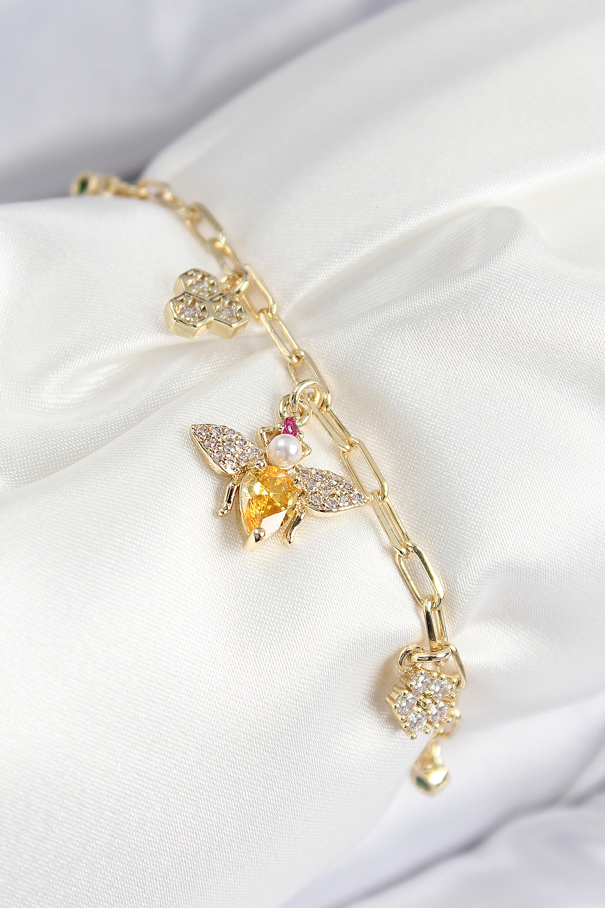 Pirinç Zirkon Taşlı Arı Model Gold Renk Kadın Bileklik - TJ-BB7771