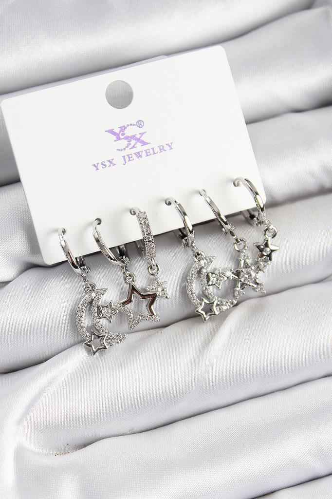 Pirinç Zİrkon Taşlı Ay ve Yıldız Model Gümüş Renk 3'lü Çift Kadın Küpe - BKP10952
