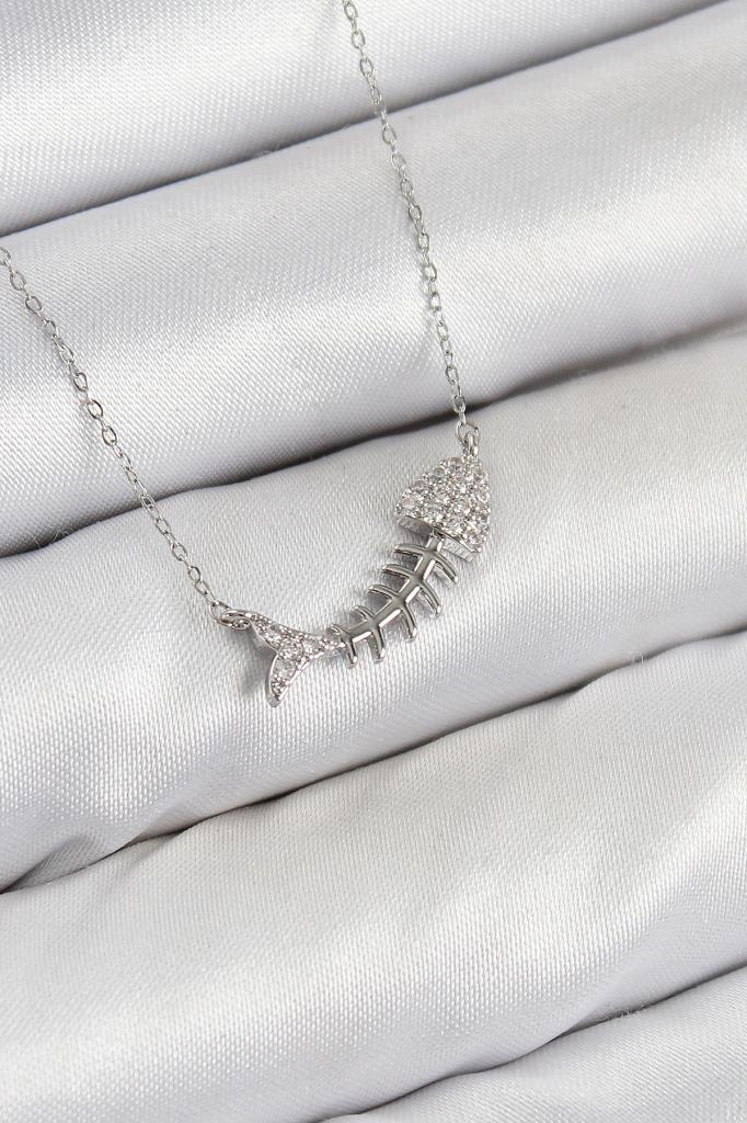 Pirinç Zirkon Taşlı Balık Kılçığı Model Gümüş Renk Kadın Kolye - BKO10413