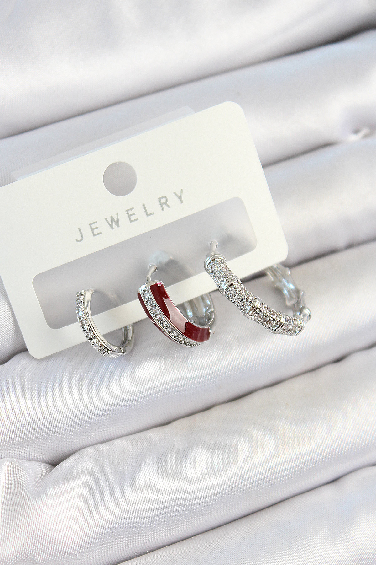 Pirinç Zirkon Taşlı Bordo Pembe Halka Model Gümüş Renk 3'lü Çift Kadın Küpe Set - TJ-BKP10791