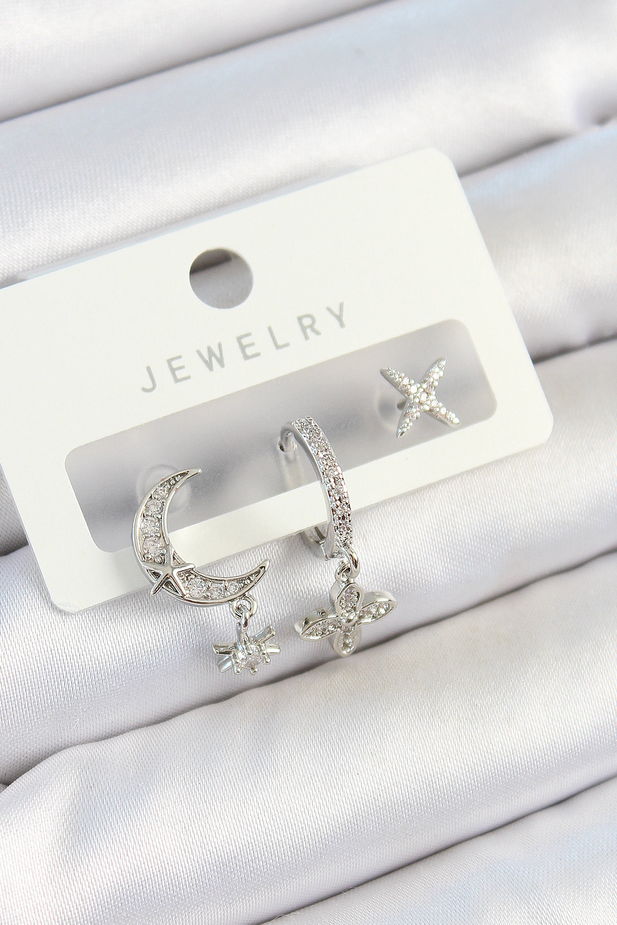 Pirinç Zirkon Taşlı Çiçek Ve Ay Model Gümüş Renk 3'lü Çift Kadın Küpe Set - TJ-BKP10804