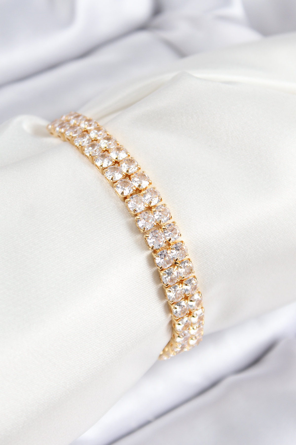 Pirinç Zirkon Taşlı Çift Sıra Kare Model Gold Renk Asansörlü Kadın Bileklik - TJ-BB7731
