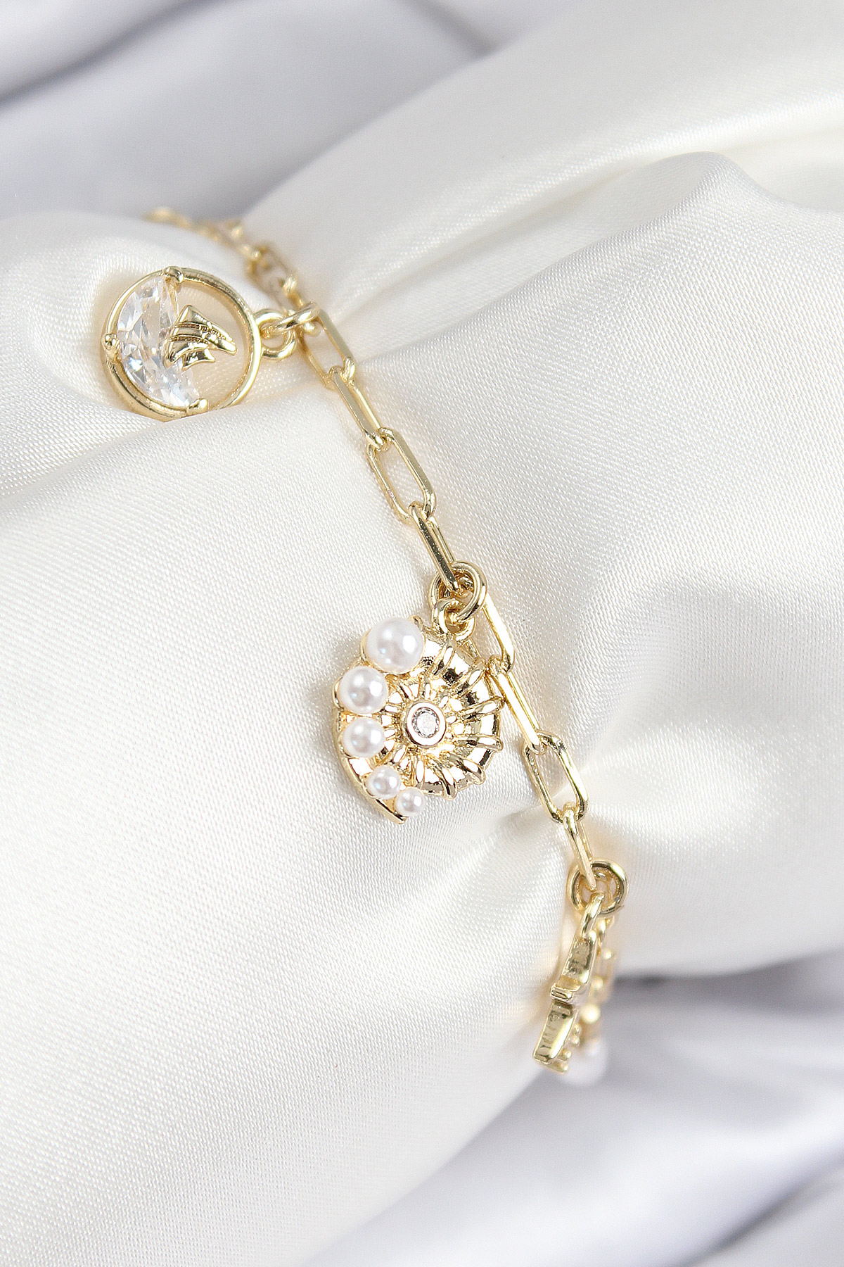 Pirinç Zirkon Taşlı Deniz Kabuğu Model Gold Renk Kadın Bileklik - TJ-BB7772