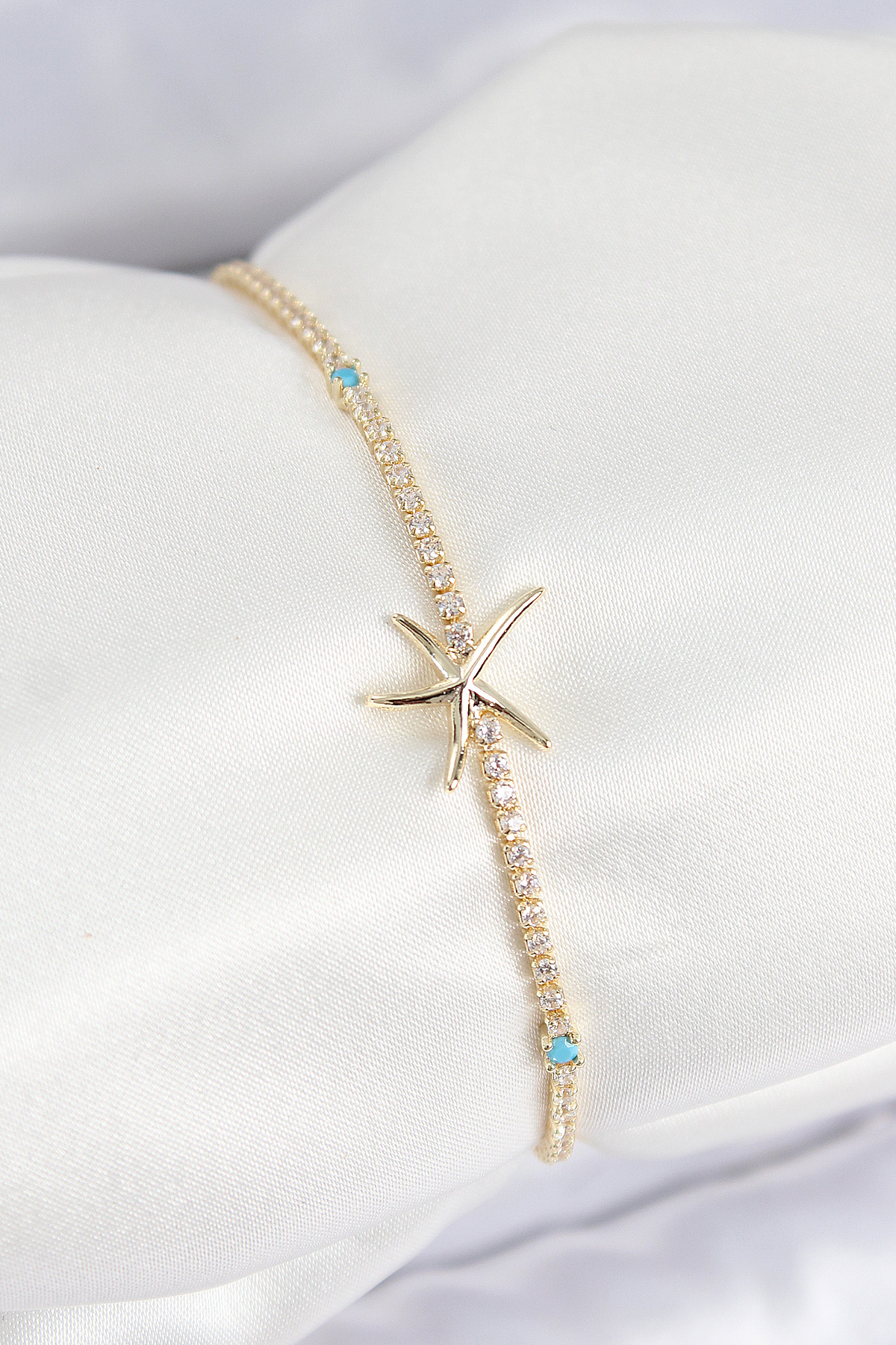 Pirinç Zirkon Taşlı Deniz Yıldızı Model Gold Renk Kadın Bilekilk - TJ-BB7657
