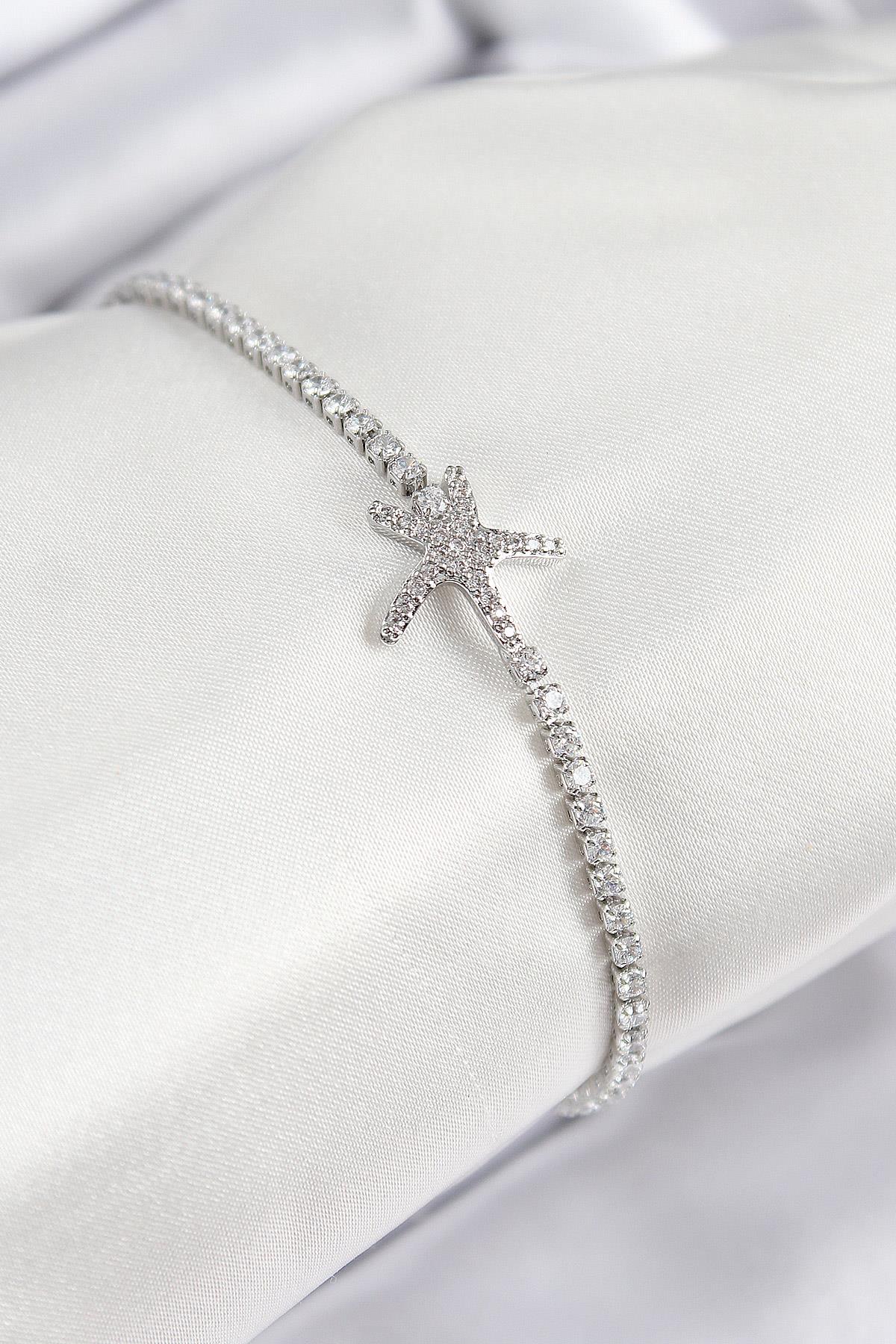 Pirinç Zirkon Taşlı Deniz Yıldızı Model Gümüş Renk Kadın Bileklik - BB7694