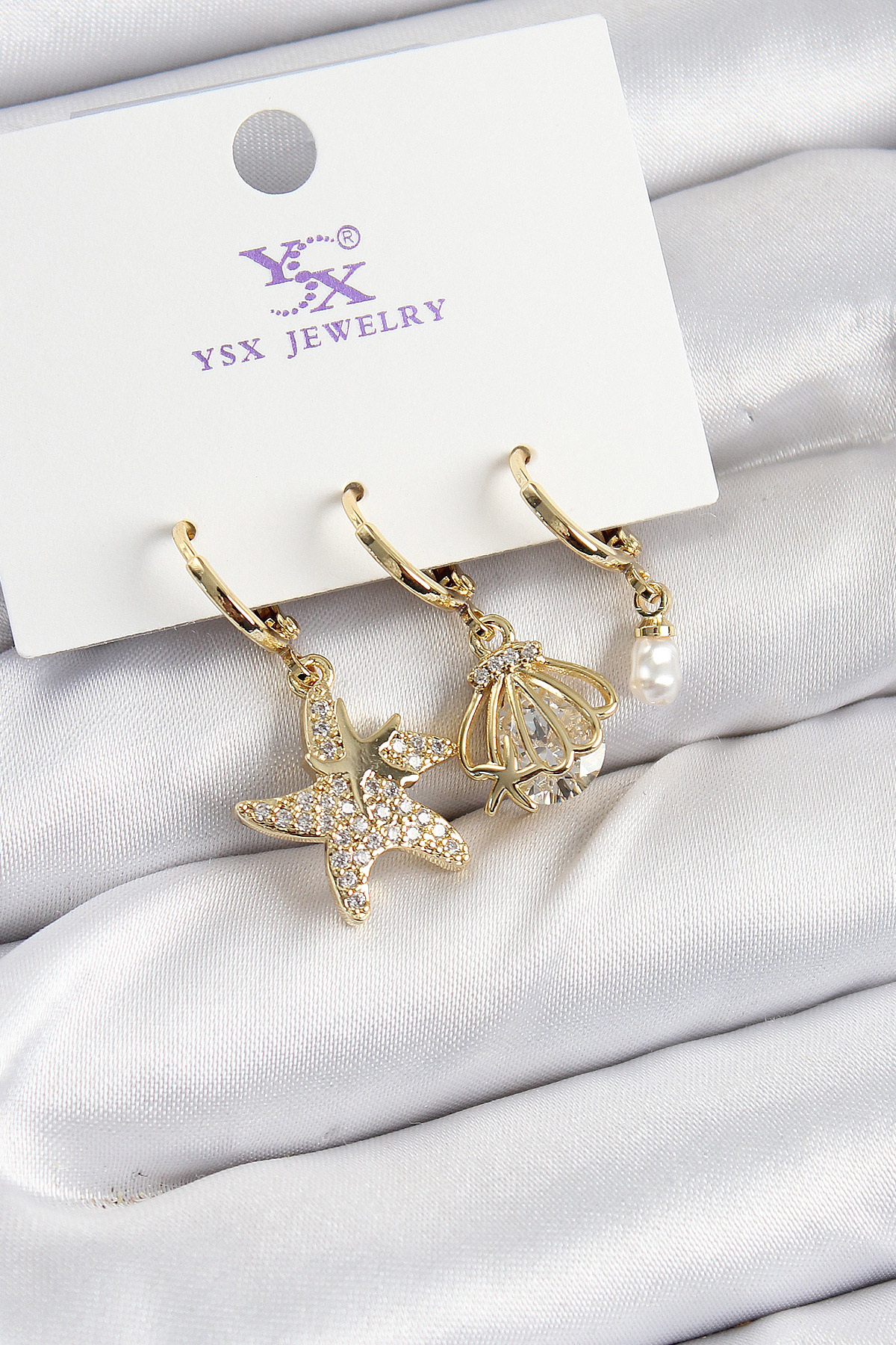 Pirinç Zİrkon Taşlı Deniz Yıldızı Ve İstiridye Model Gold Renk 3'lü Kadın Küpe - TJ-BKP10944