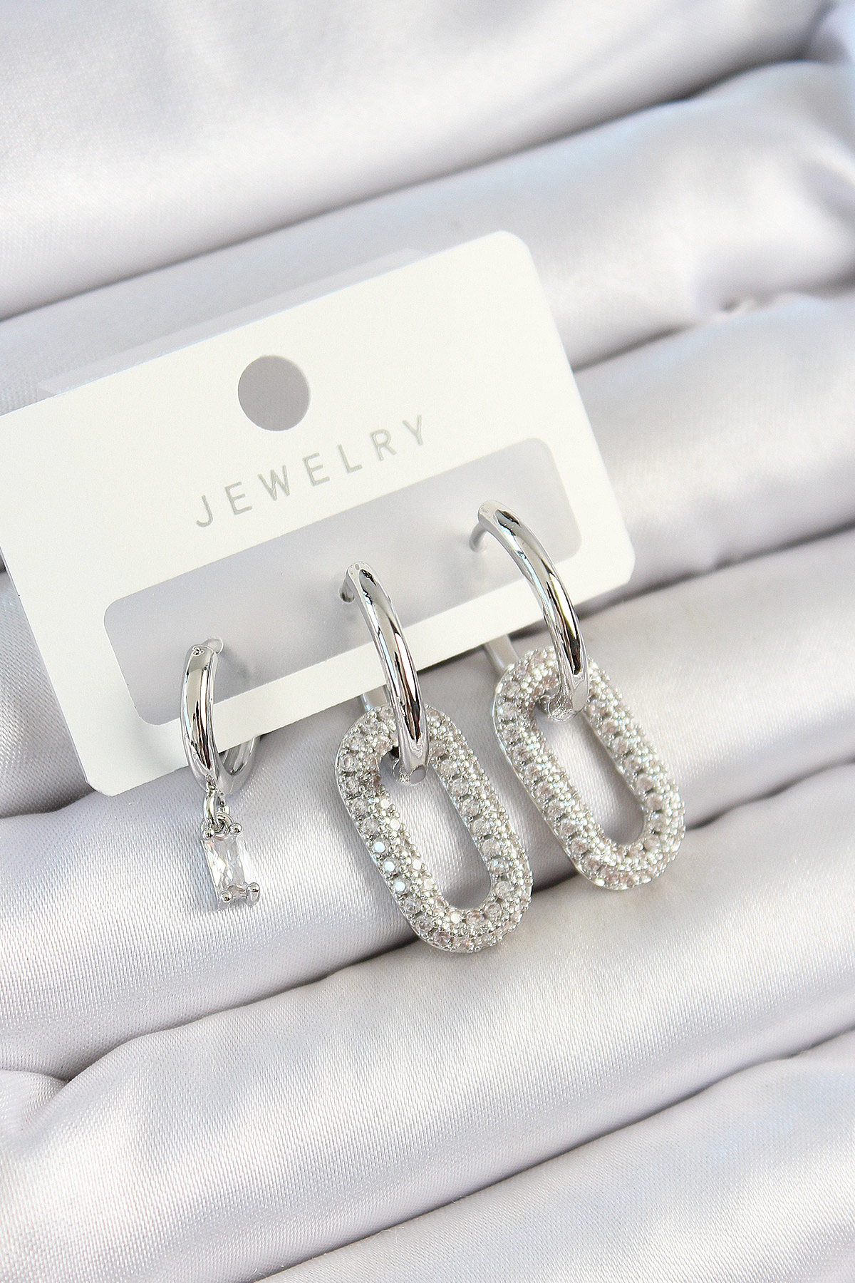 Pirinç Zirkon Taşlı Dikdörtgen Model Gümüş Renk 3'lü Çift Kadın Küpe Set - TJ-BKP10796