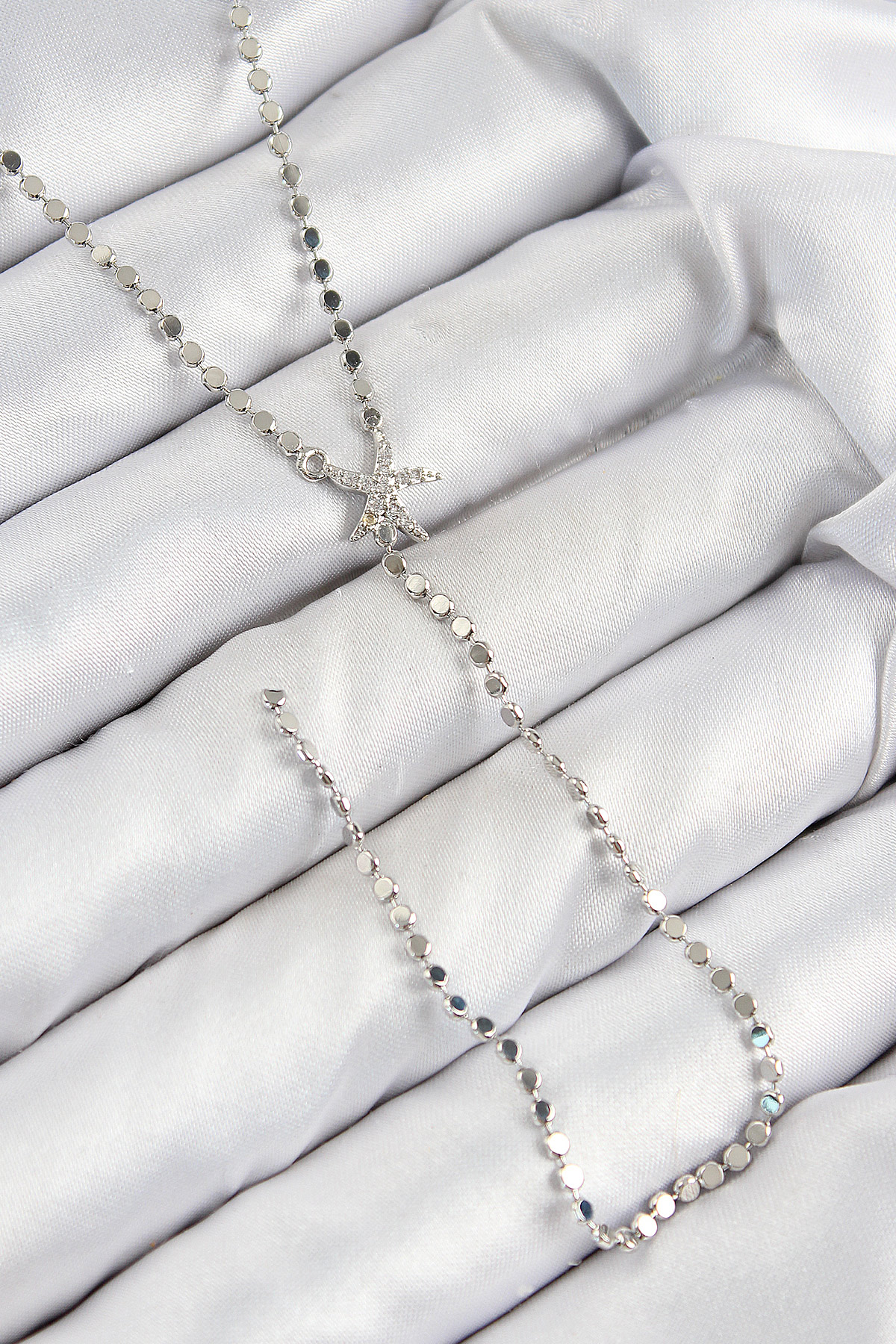 Pirinç Zirkon Taşlı Ezme Zincirli Deniz Yıldızı Model Gümüş Renk Y Kolye - TJ-BKO10466