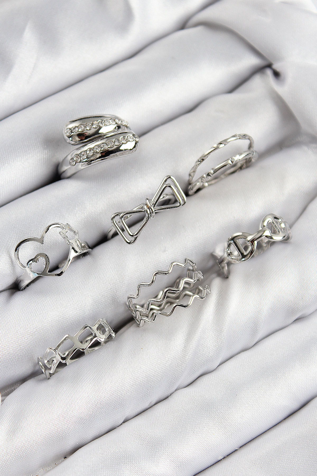 Pirinç Zirkon Taşlı Fiyonk Ve Kalp Model Gümüş Renk Kadın Yüzük Kombin Set - TJ-BYK3822