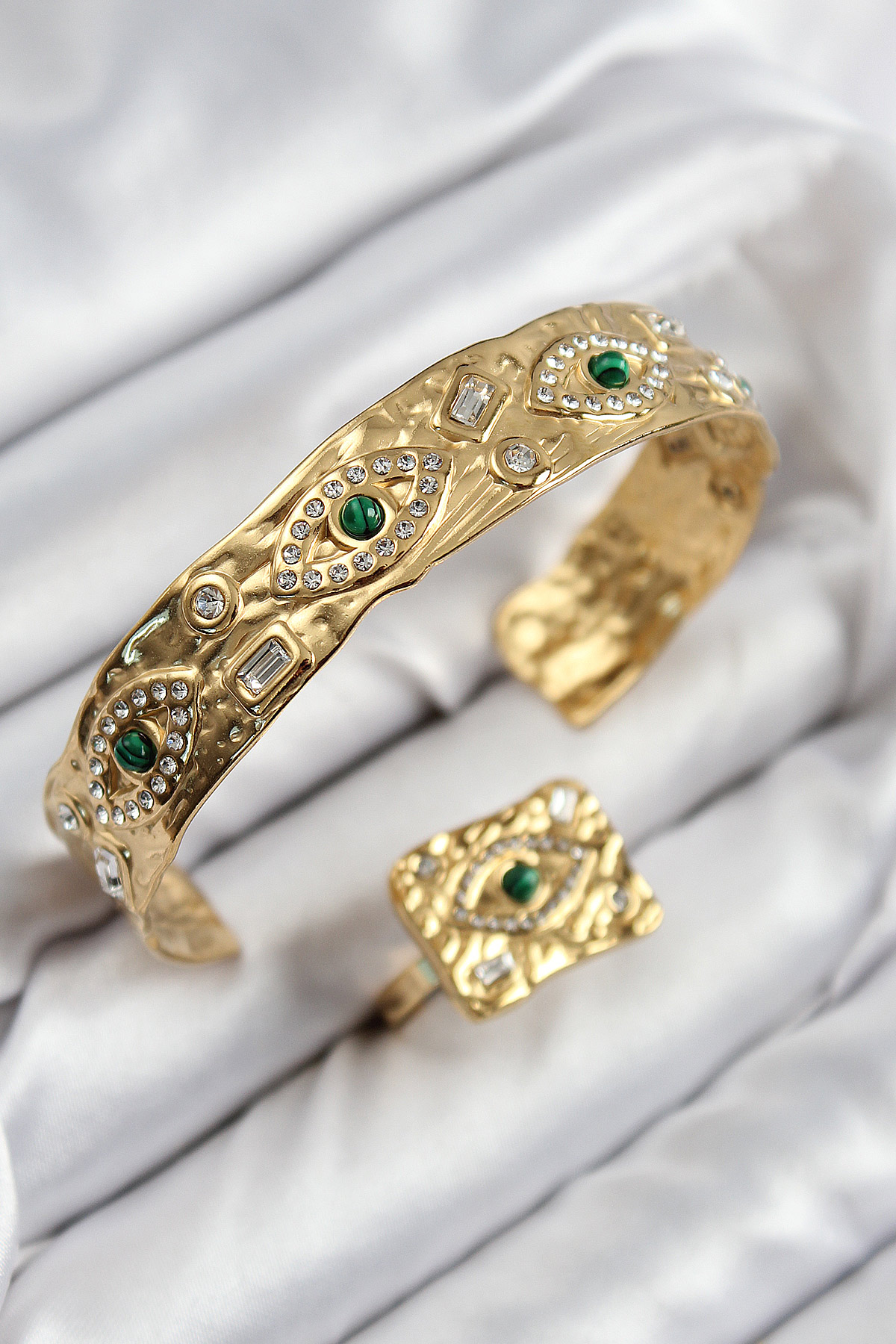 Pirinç Zirkon Taşlı Göz Model Gold Renk Bileklik Yüzük Set - TJ-BB7608