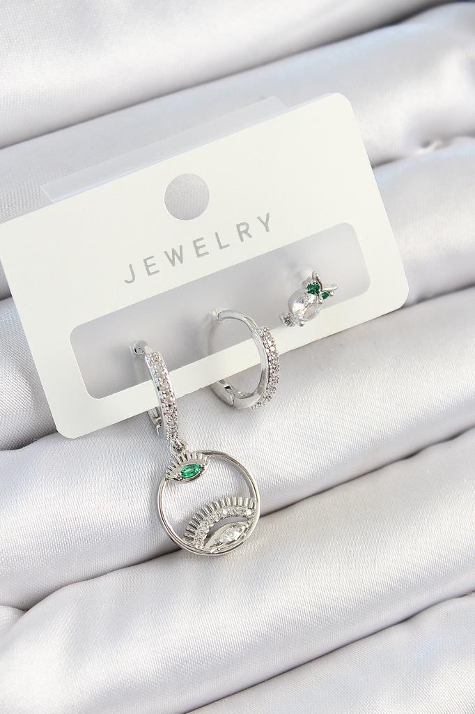 Pirinç Zirkon Taşlı Göz Ve Baykuş Model Gümüş Renk 3'lü Çift Kadın Küpe Set - BKP10795