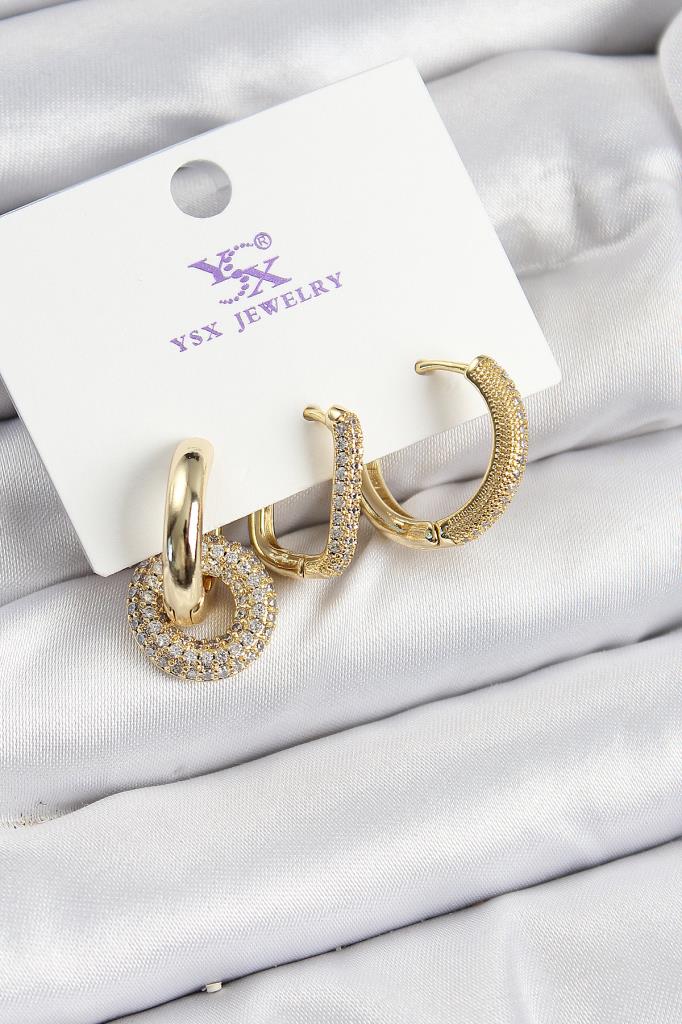 Pirinç Zİrkon Taşlı Halka Model Gold Renk 3'lü Kadın Küpe - BKP10945