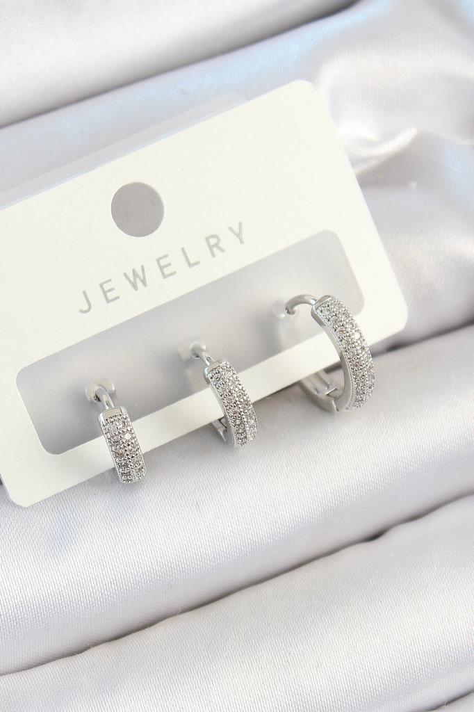 Pirinç Zirkon Taşlı Halka Model Gümüş Renk 3'lü Çift Kadın Küpe Set - BKP10812