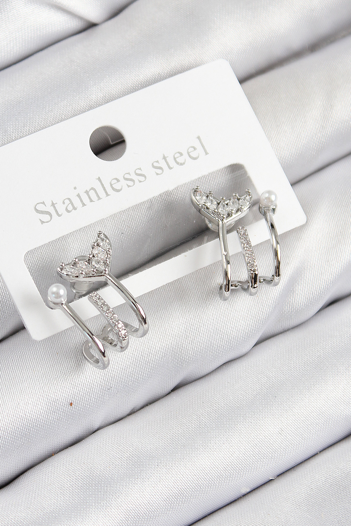 Pirinç Zirkon Taşlı İnci Detaylı Balık Kuyruğu Model Gümüş Renk Kadın Küpe - TJ-BKP11094