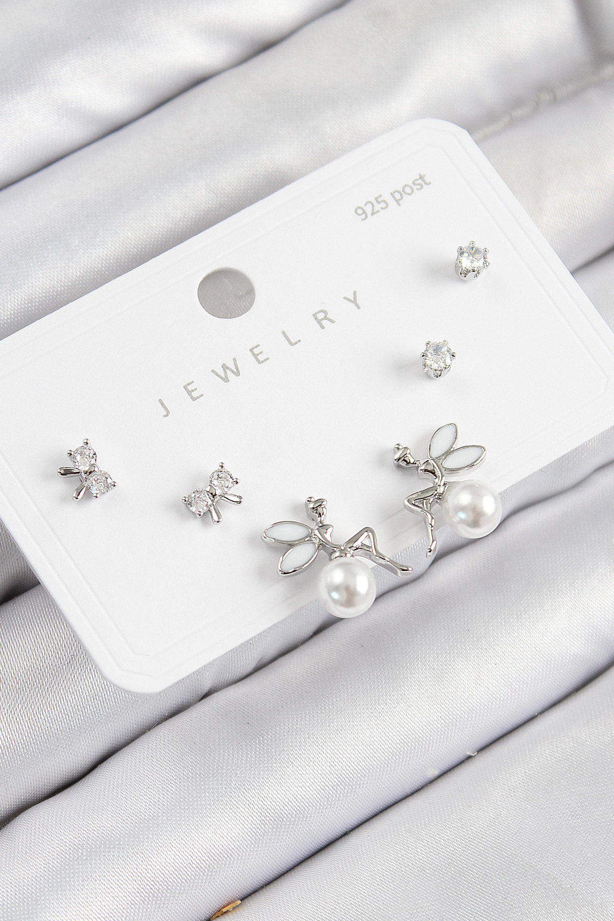 Pirinç Zirkon Taşlı İnci Melek Model Gümüş Renk 925 Ayar Gümüş Çivi Kadın Küpe Set - TJ-BKP11187