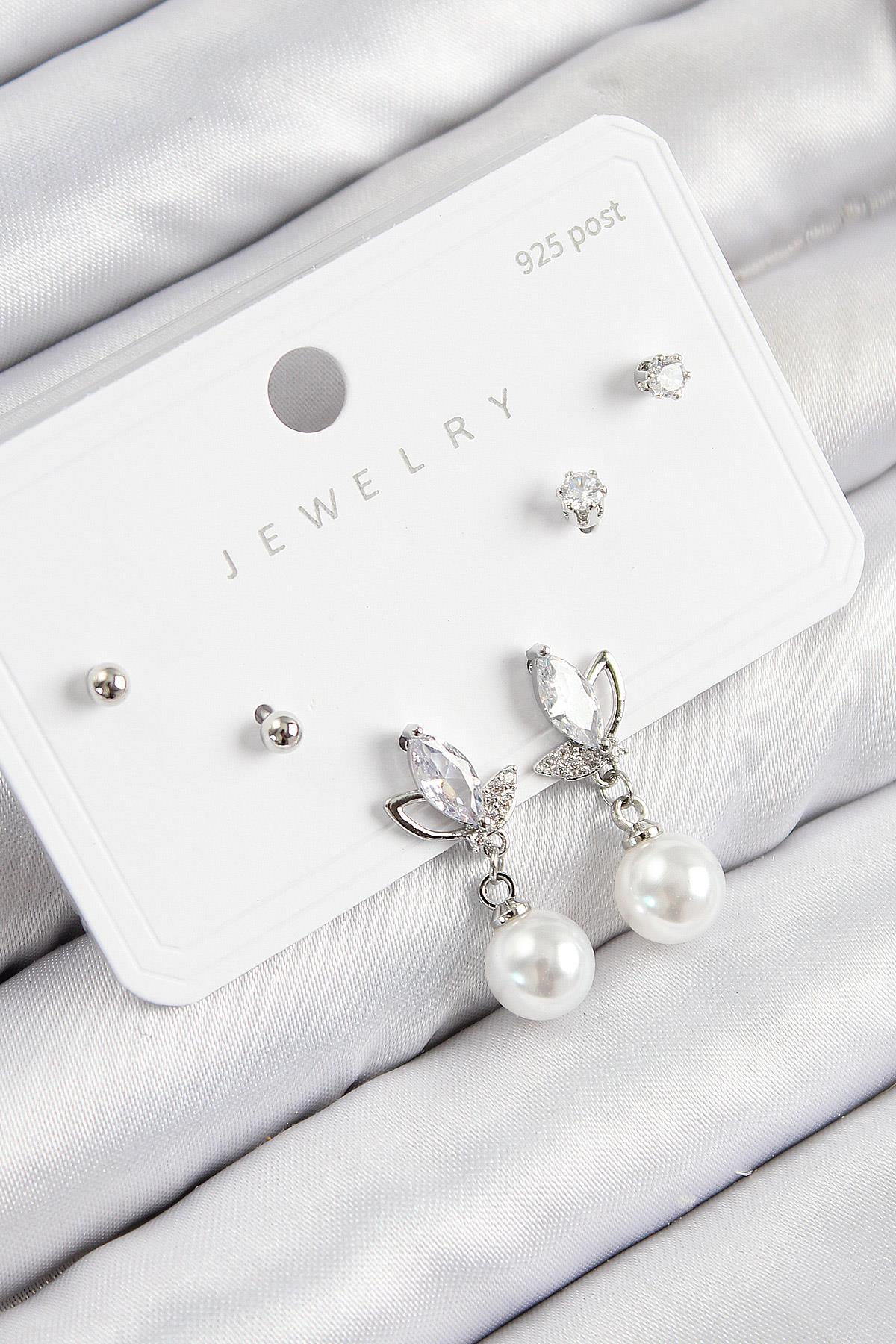 Pirinç Zirkon Taşlı İnci Sallantılı Damla Model Gümüş Renk 925 Ayar Gümüş Çivi Kadın Küpe Set - BKP11183