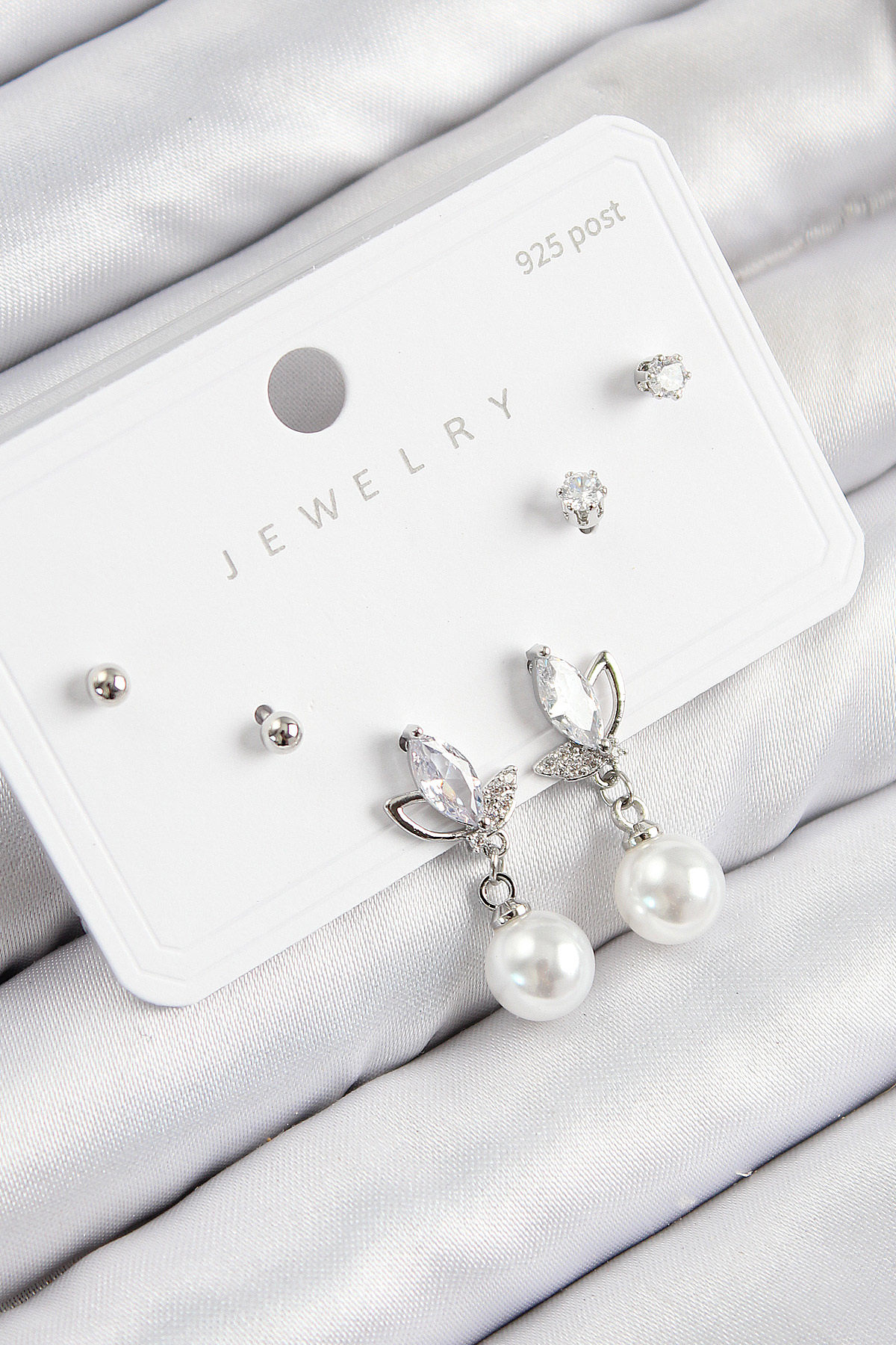Pirinç Zirkon Taşlı İnci Sallantılı Damla Model Gümüş Renk 925 Ayar Gümüş Çivi Kadın Küpe Set - TJ-BKP11183