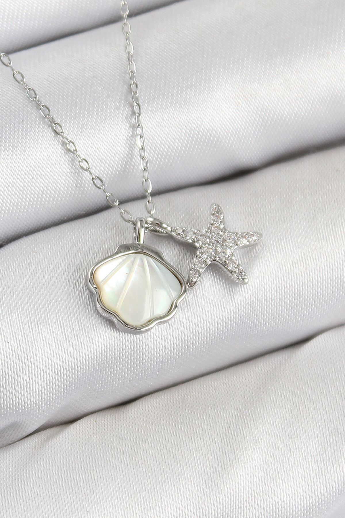 Pirinç Zirkon Taşlı İstiridye Ve Deniz Yıldızı Model Gümüş Renk Kadın Kolye - TJ-BKO10411