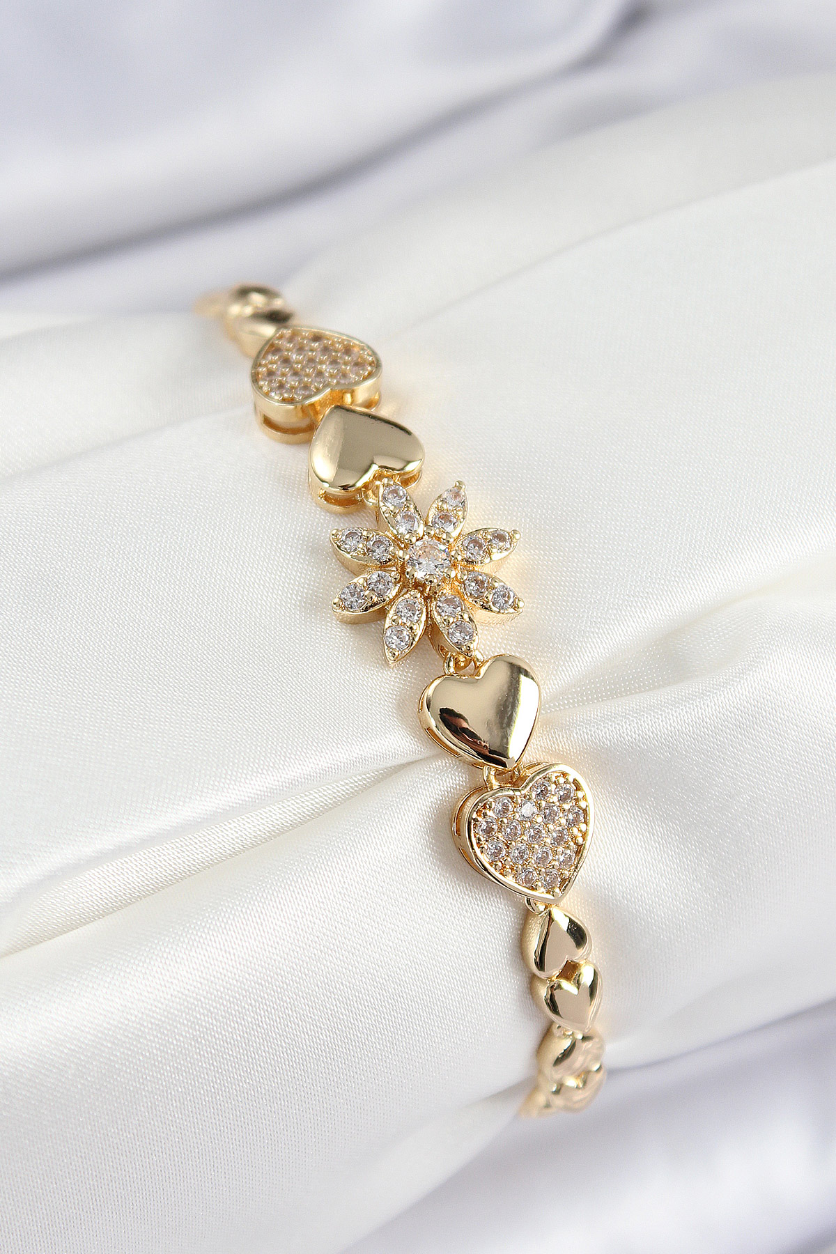 Pirinç Zirkon Taşlı Kalp Detaylı Çiçek Model Gold Renk Kadın Bileklik - TJ-BB7527
