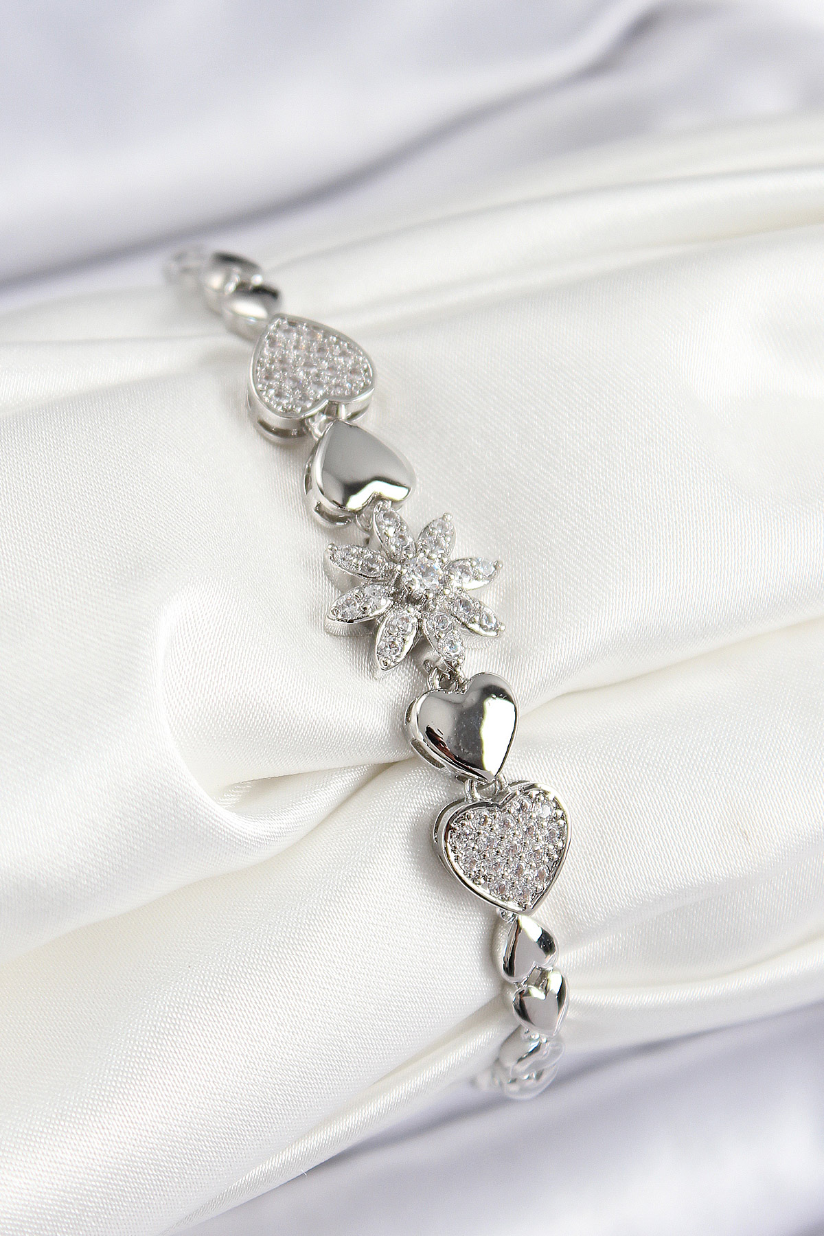 Pirinç Zirkon Taşlı Kalp Detaylı Çiçek Model Gümüş Renk Kadın Bileklik - TJ-BB7528