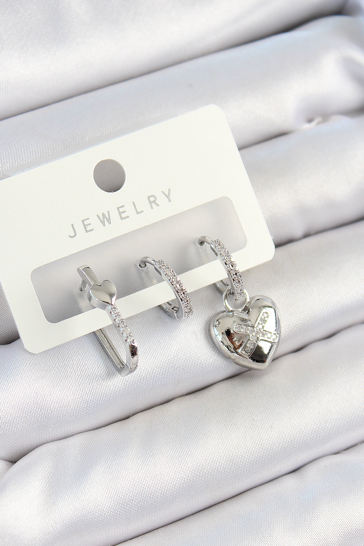 Pirinç Zirkon Taşlı Kalp Model Gümüş Renk 3'lü Çift Kadın Küpe Set - TJ-BKP10794