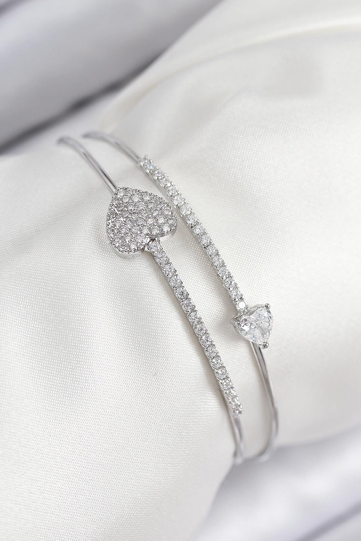 Pirinç Zirkon Taşlı Kalp Model Gümüş Renk Kadın Bileklik - TJ-BB7852