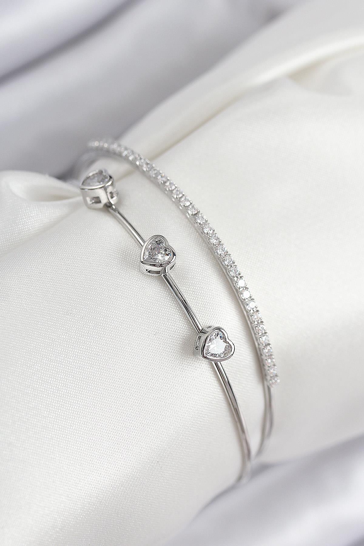 Pirinç Zirkon Taşlı Kalp Model Gümüş Renk Kadın Bileklik - TJ-BB7862