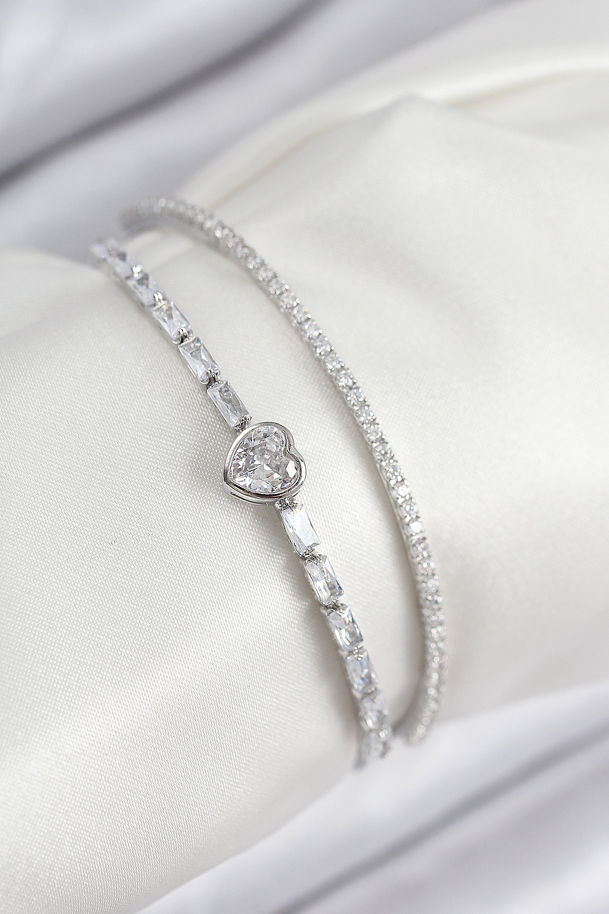 Pirinç Zirkon Taşlı Kalp Model Gümüş Renk Kadın Bileklik - TJ-BB7874