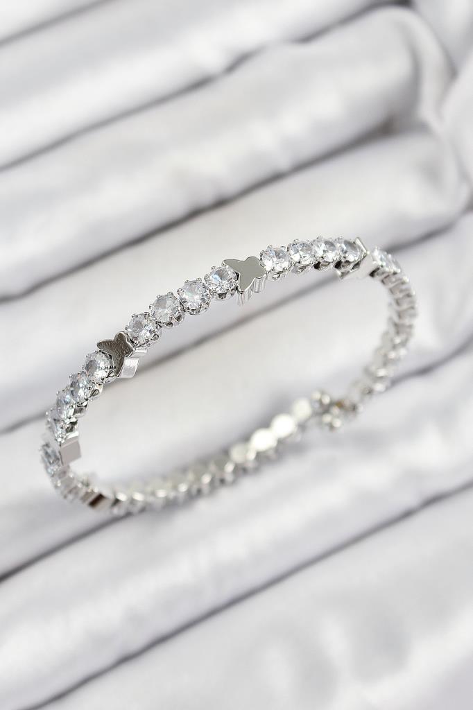 Pirinç Zirkon Taşlı Kalp Model Gümüş Renk Yaylı Kadın Bileklik - BB7220