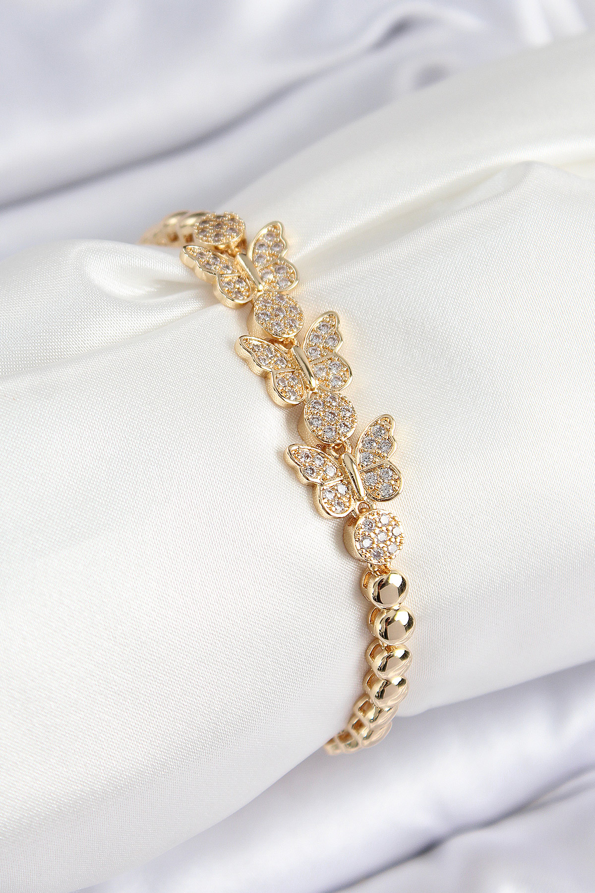 Pirinç Zirkon Taşlı Kelebek Model Gold Renk Kadın Bileklik - TJ-BB7541