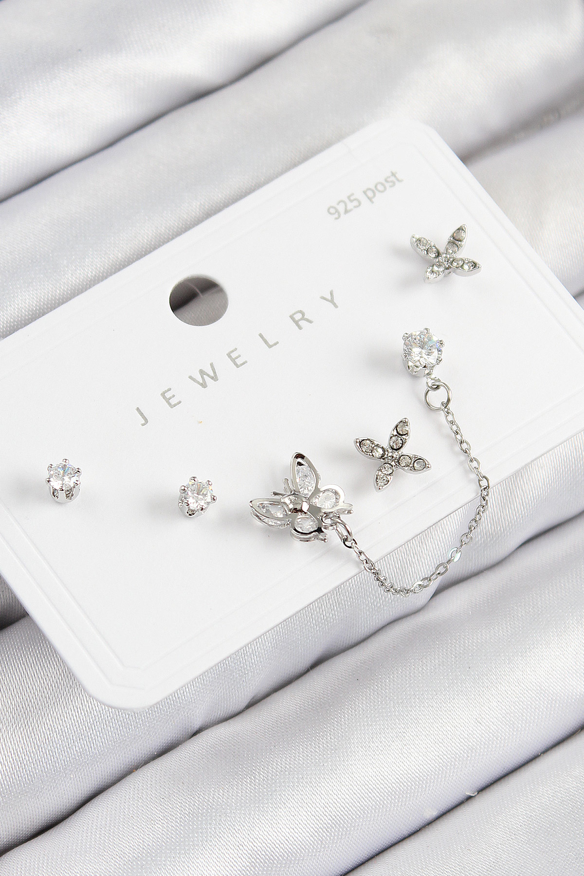 Pirinç Zirkon Taşlı Kelebek Model Gümüş Renk 925 Ayar Gümüş Çivi Kadın Küpe Set - TJ-BKP11159