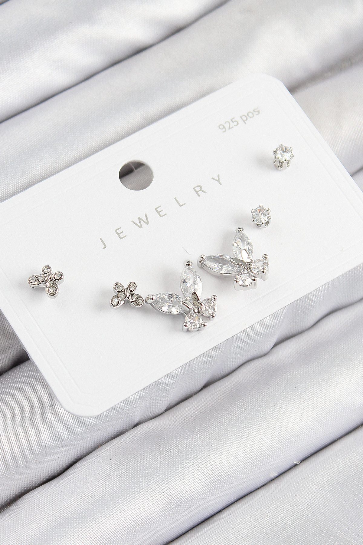 Pirinç Zirkon Taşlı Kelebek Model Gümüş Renk 925 Ayar Gümüş Çivi Kadın Küpe Set - TJ-BKP11165