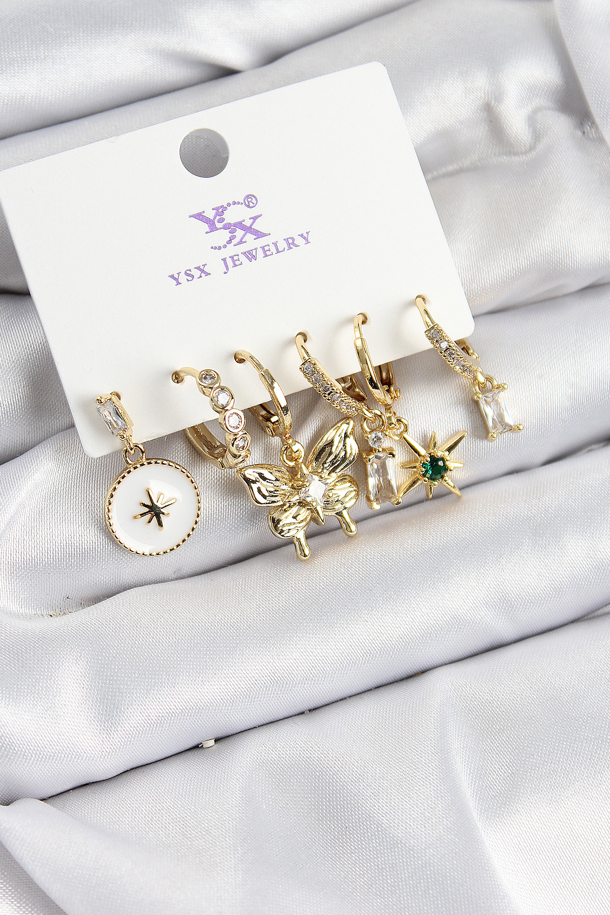 Pirinç Zİrkon Taşlı Kelebek ve Yıldız Model Gold Renk 3'lü Çift Kadın Küpe - TJ-BKP10959