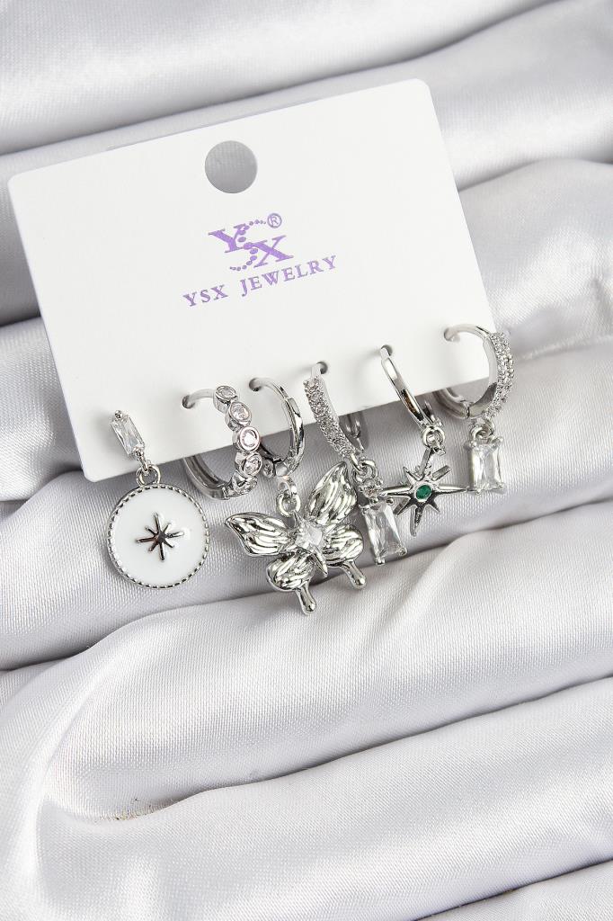 Pirinç Zİrkon Taşlı Kelebek ve Yıldız Model Gümüş Renk 3'lü Çift Kadın Küpe - BKP10958