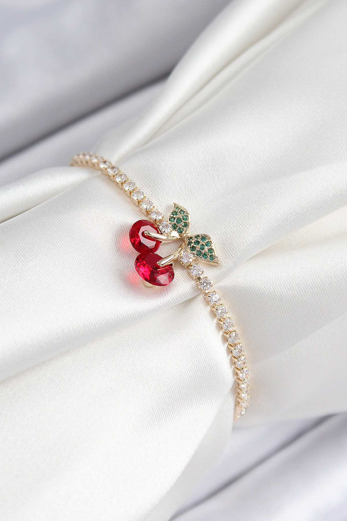 Pirinç Zirkon Taşlı Kiraz Model Gold Renk Asansörlü Kadın Bileklik - TJ-BB7455