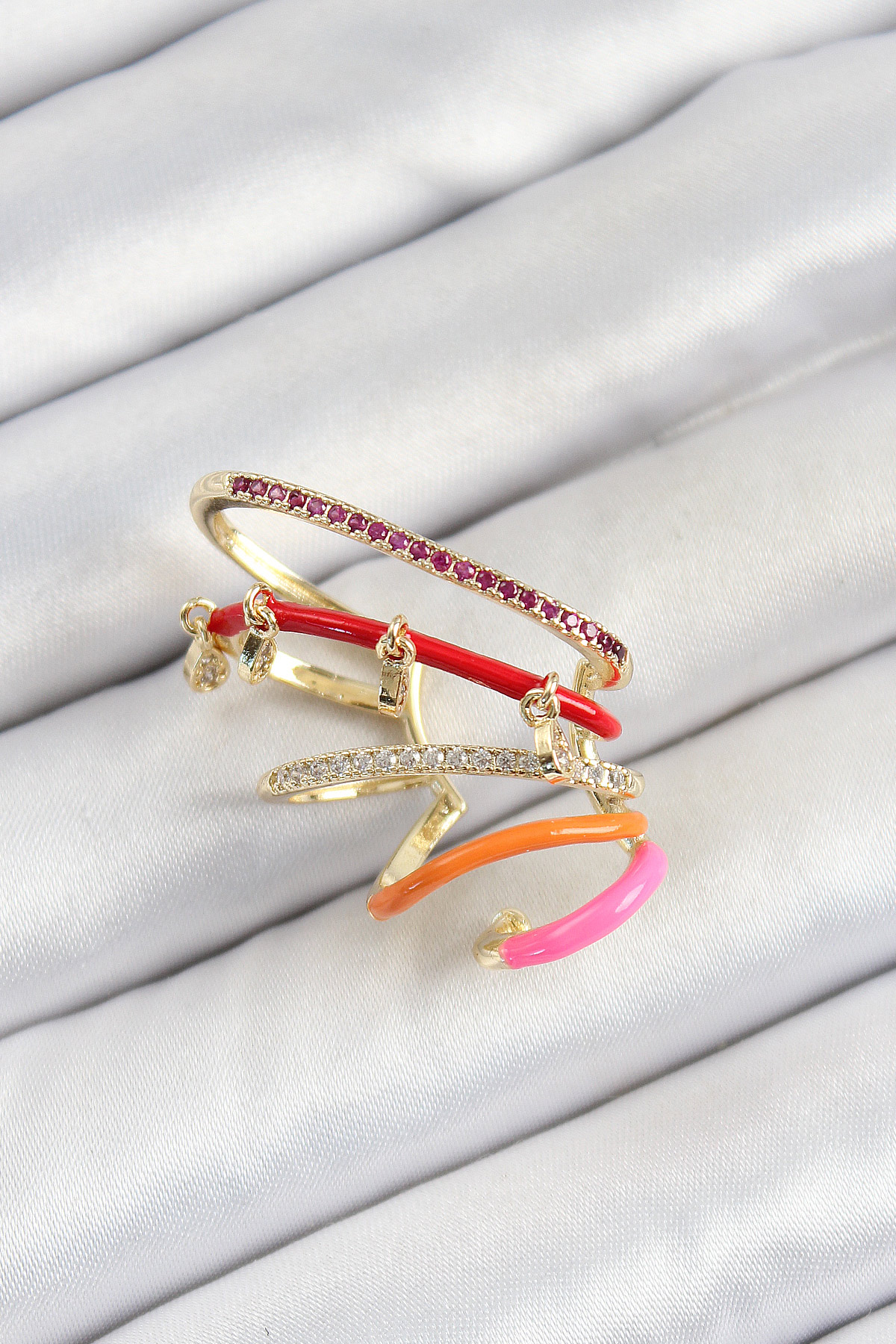 Pirinç Zirkon Taşlı Kırmızı Turuncu Pembe Sıkıştırma Sağ Kıkırdak Gold Renk Kadın Küpe - TJ-BKP10755