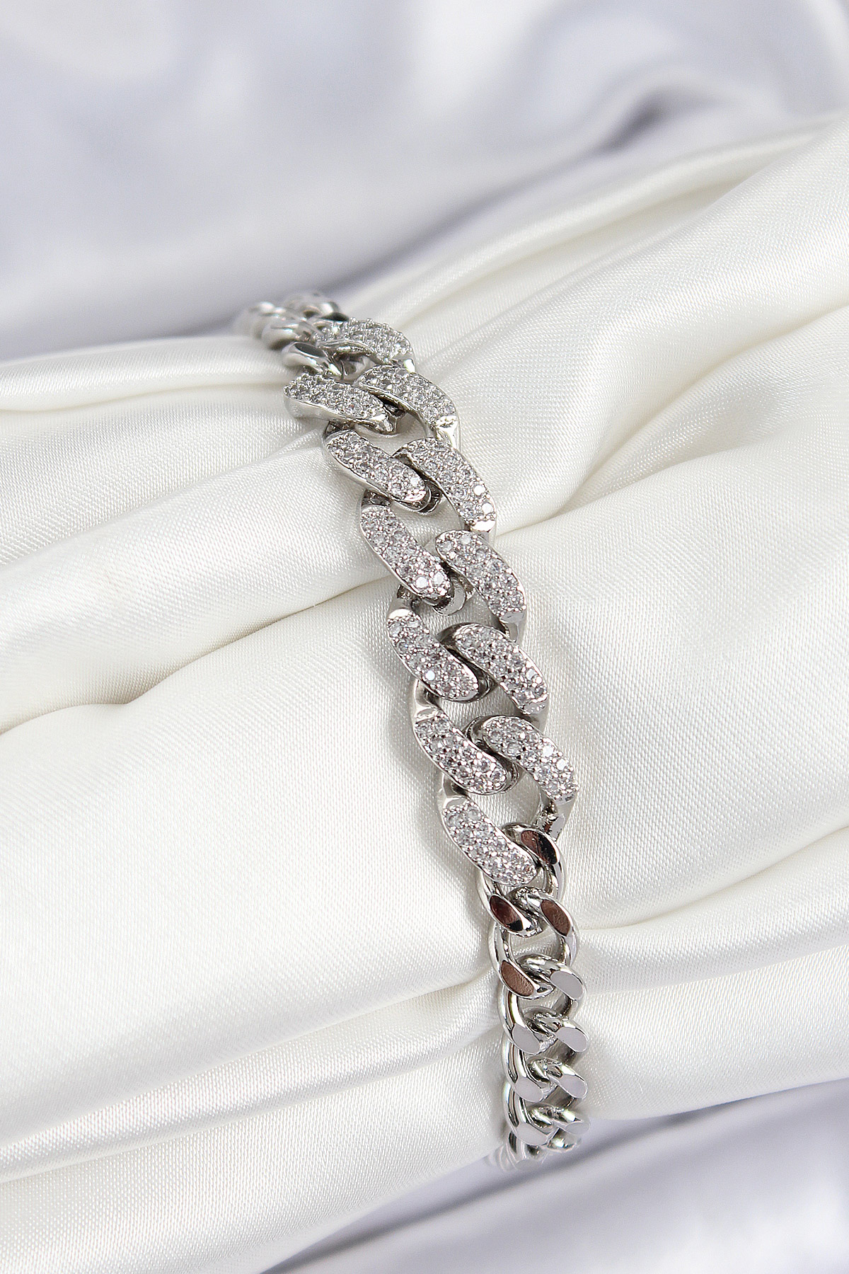 Pirinç Zirkon Taşlı Küba Zincir Model Gümüş Renk Kadın Bileklik - TJ-BB7534