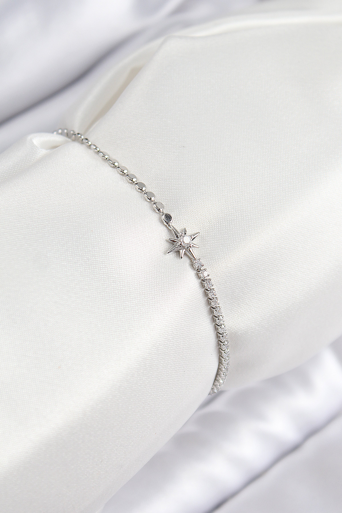 Pirinç Zirkon Taşlı Kutup Yıldızı Model Ezme Zincir Gümüş Renk Kadın Bileklik - TJ-BB7588