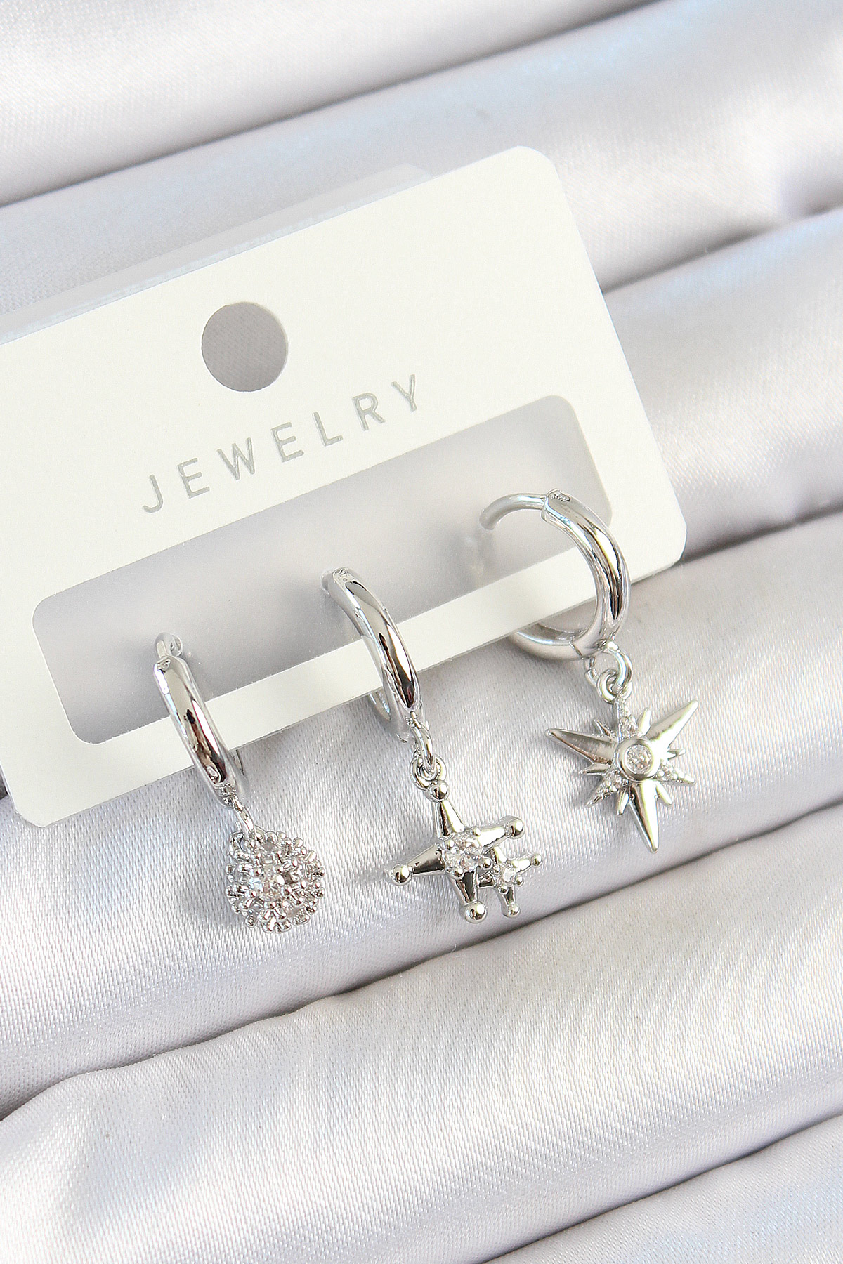 Pirinç Zirkon Taşlı Kutup Yıldızı Model Gümüş Renk 3'lü Çift Kadın Küpe Set - TJ-BKP10807