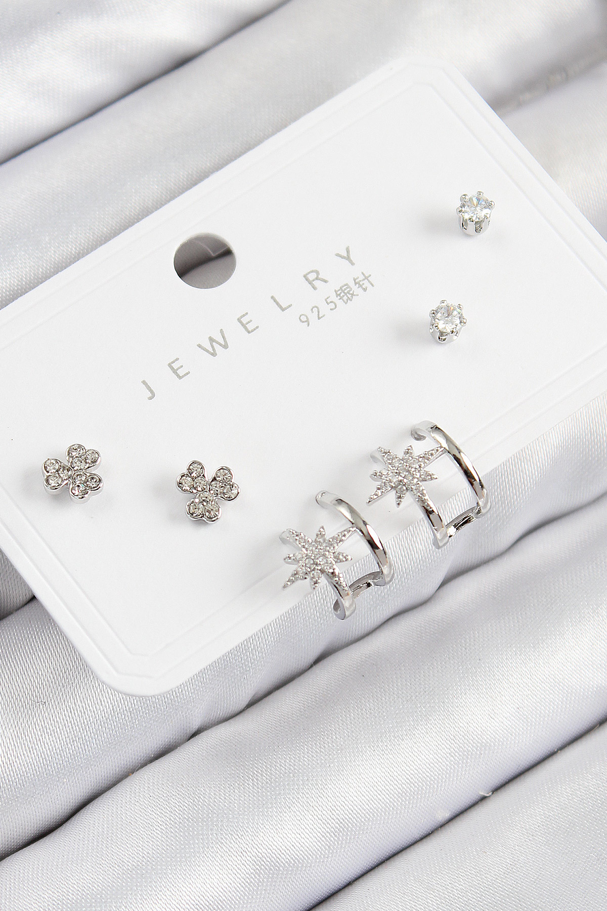 Pirinç Zirkon Taşlı Kutup Yıldızı Model Gümüş Renk 925 Ayar Gümüş Çivi Kadın Küpe Set - TJ-BKP11167