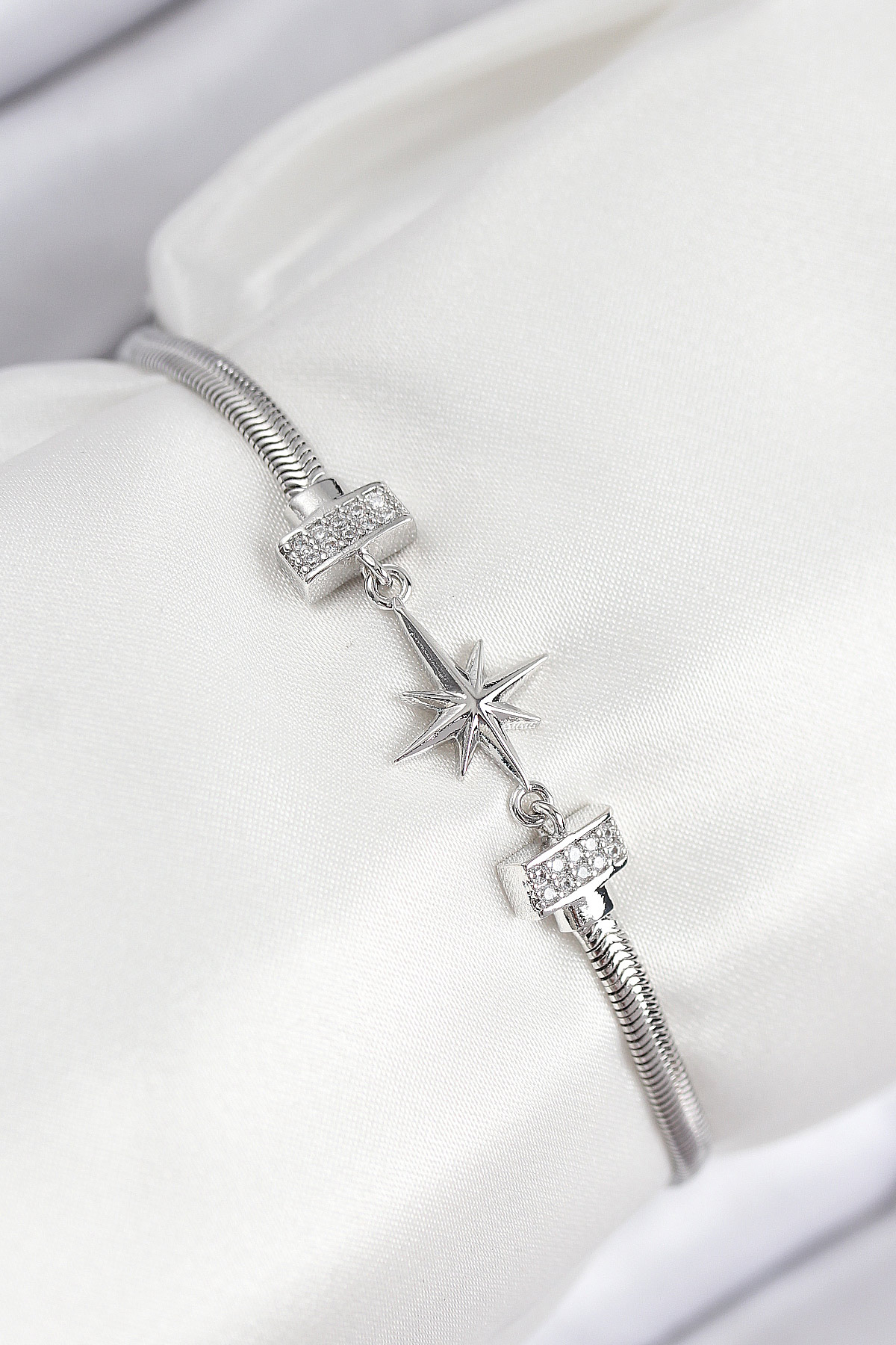Pirinç Zirkon Taşlı Kutup Yıldızı Model Gümüş Renk Kadın Bileklik - TJ-BB7904