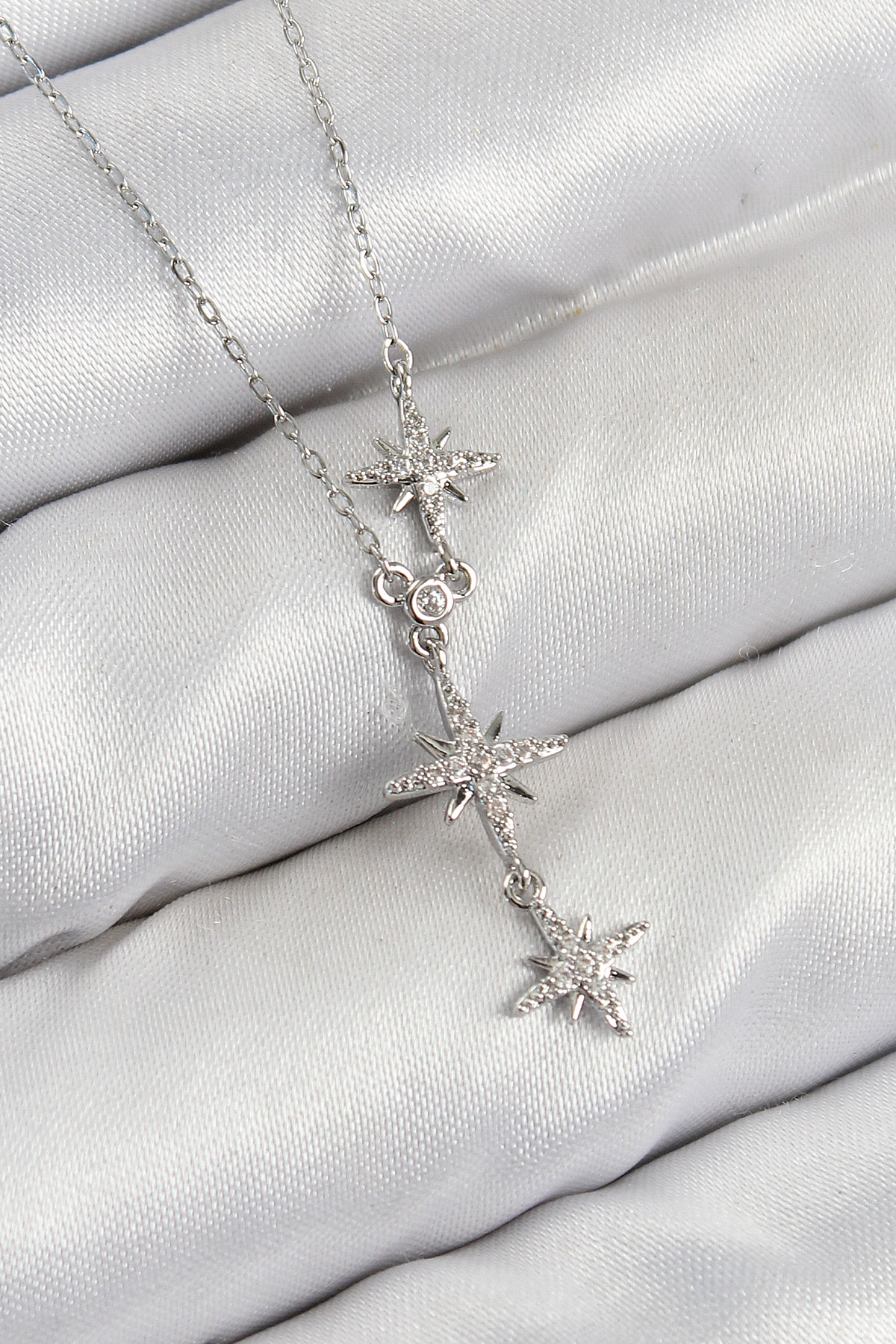 Pirinç Zirkon Taşlı Kutup Yıldızı Model Gümüş Renk Kadın Kolye - TJ-BKO10427