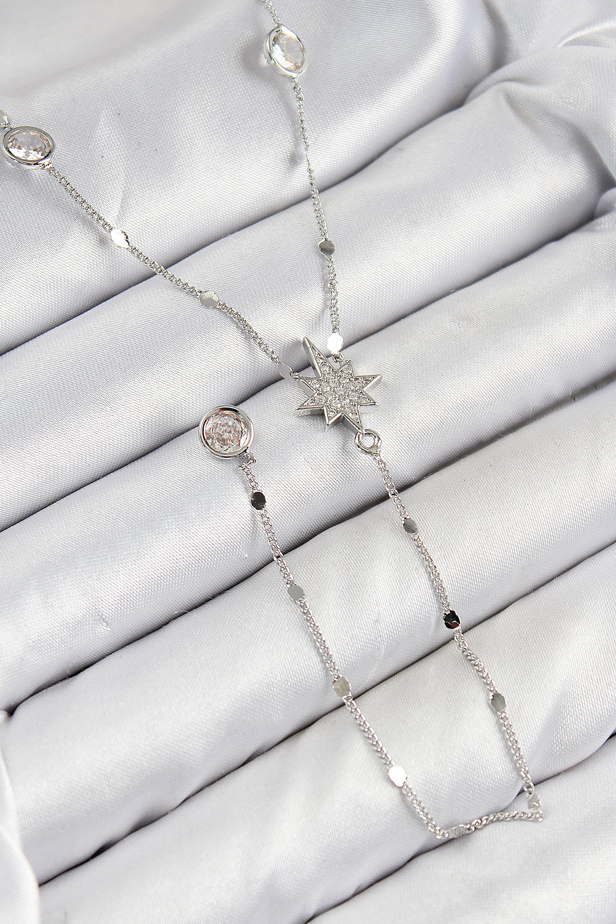 Pirinç Zirkon Taşlı Kutup Yıldızı Model Gümüş Renk Y Kolye - TJ-BKO10453
