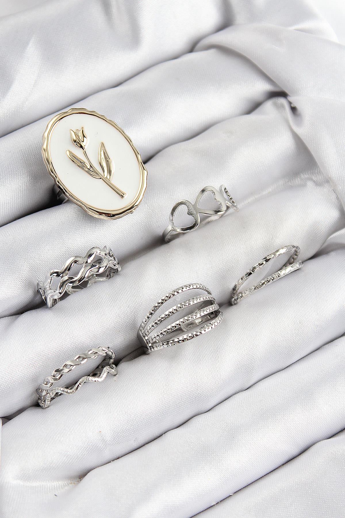 Pirinç Zirkon Taşlı Lale Model Gümüş Renk Kadın Yüzük Kombin Set - BYK3824