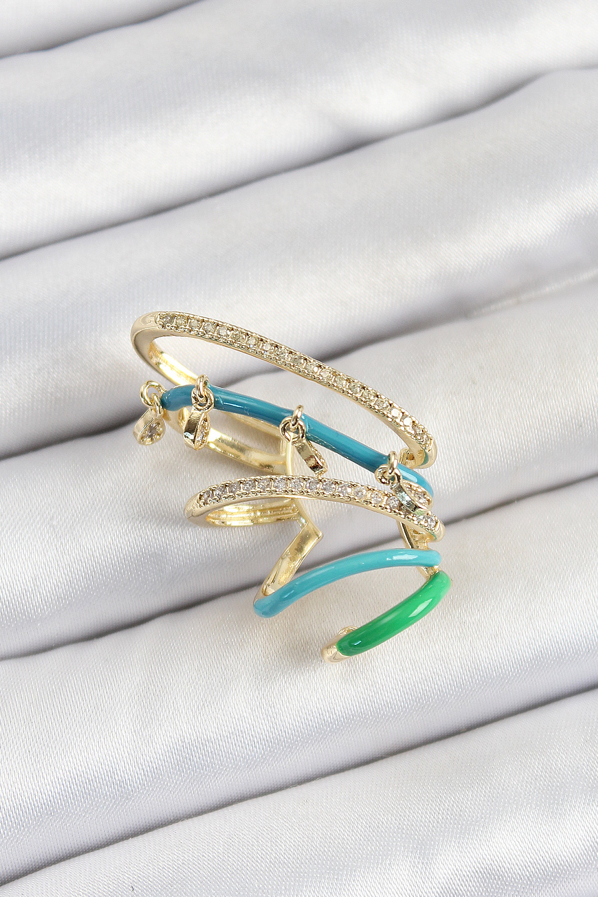 Pirinç Zirkon Taşlı Mavi Yeşil Sıkıştırma Sağ Kıkırdak Gold Renk Kadın Küpe - TJ-BKP10754