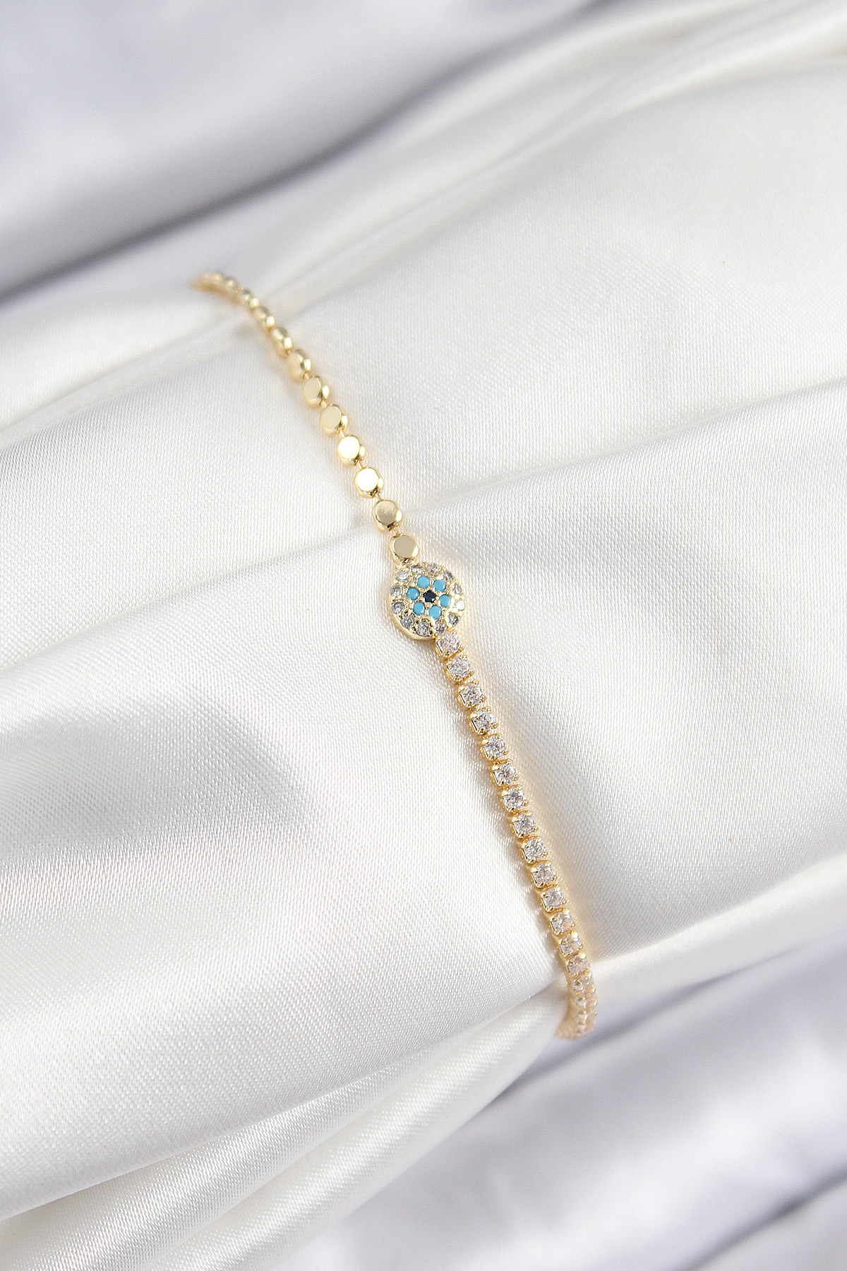 Pirinç Zirkon Taşlı Nazar Model Ezme Zincir Gold Renk Kadın Bileklik - TJ-BB7583