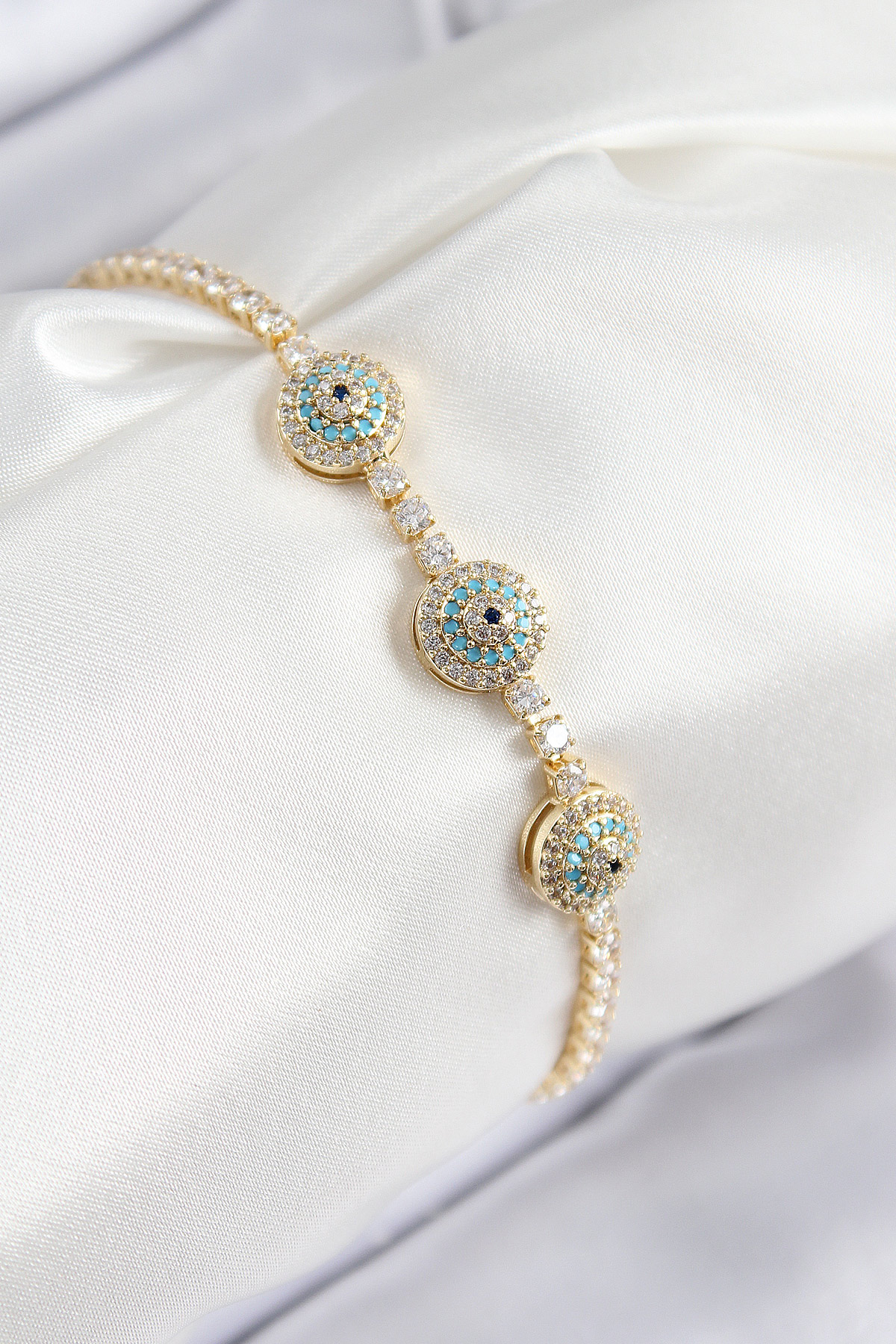 Pirinç Zirkon Taşlı Nazar Model Gold Renk Kadın Bileklik - TJ-BB7705