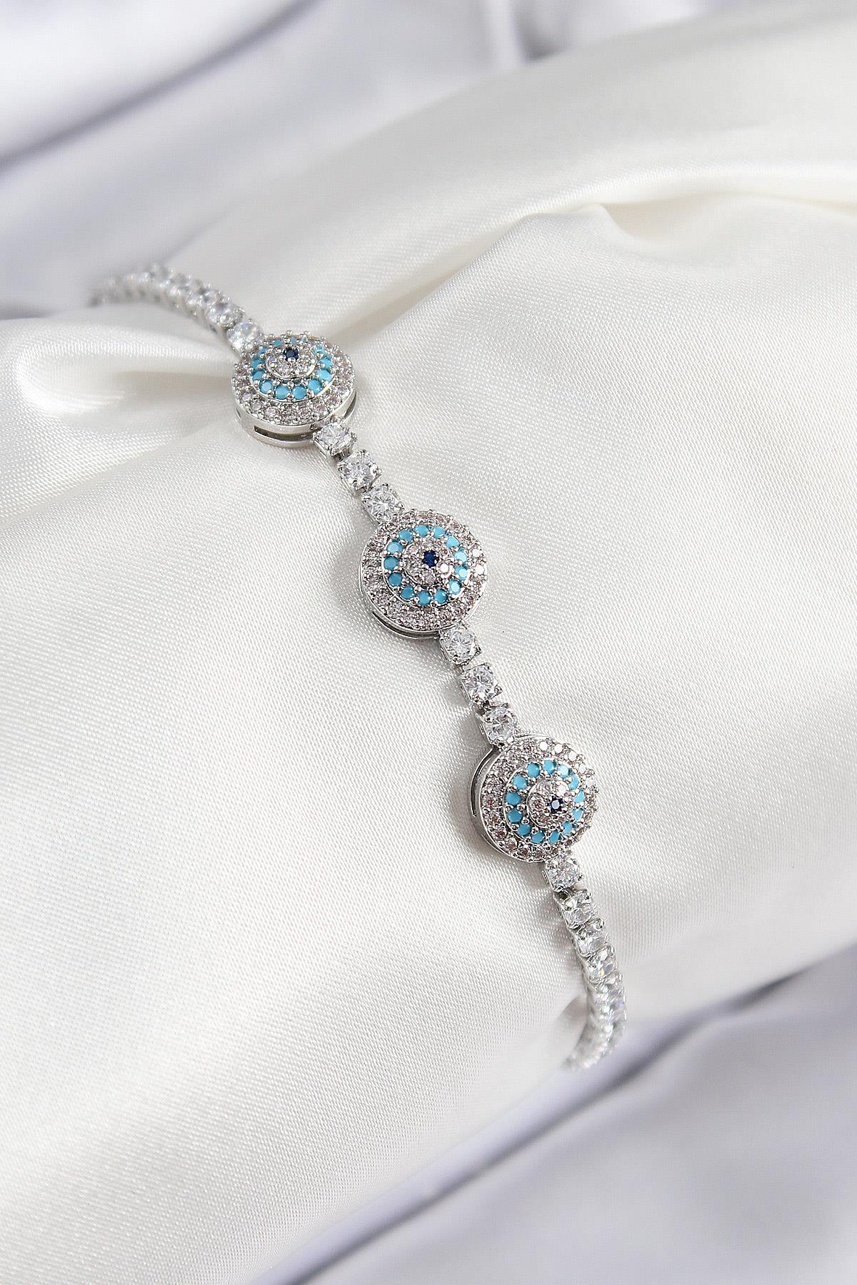 Pirinç Zirkon Taşlı Nazar Model Gümüş Renk Kadın Bileklik - BB7704