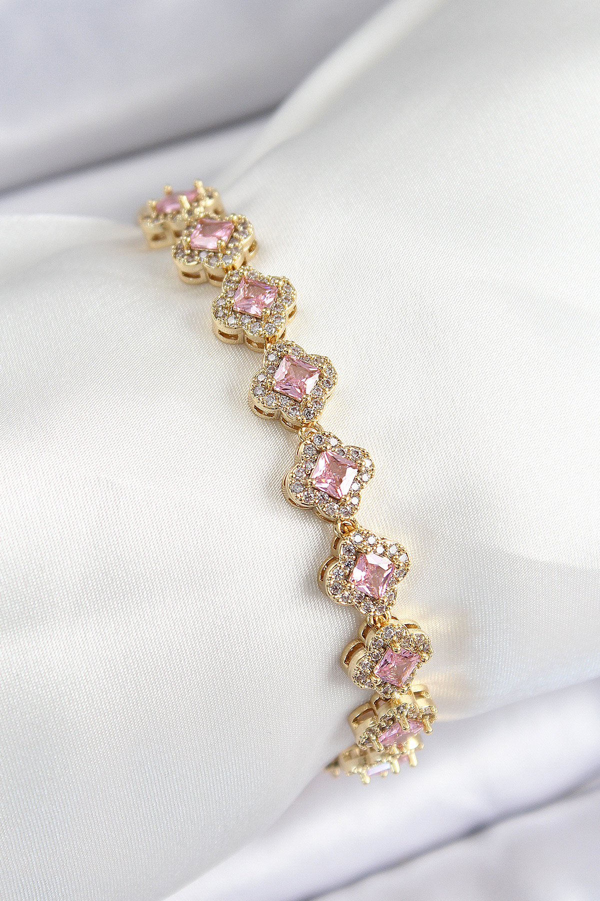 Pirinç Zirkon Taşlı Pembe Yonca Baget Model Gold Renk VIP Seri Kadın Bileklik - TJ-BB7506