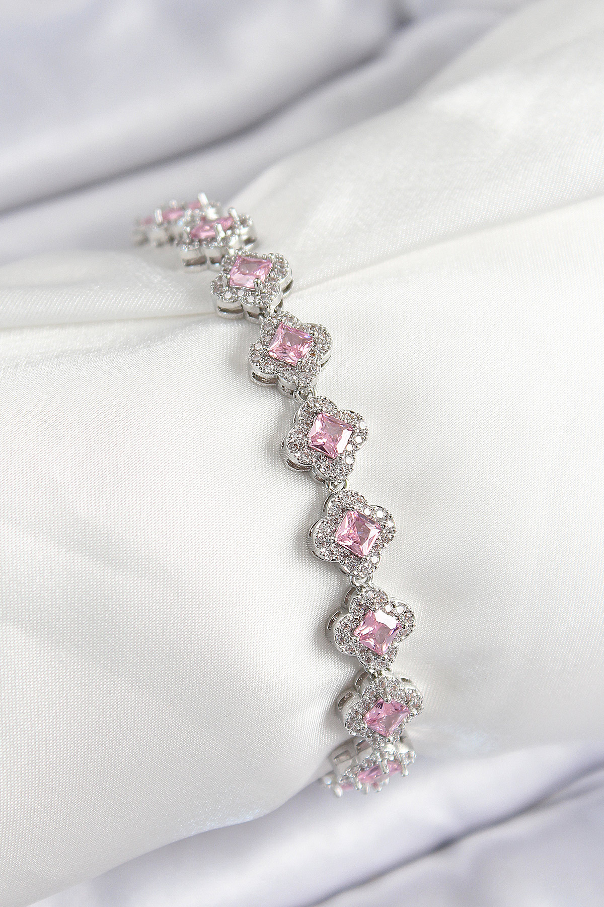 Pirinç Zirkon Taşlı Pembe Yonca Baget Model Gümüş Renk VIP Seri Kadın Bileklik - TJ-BB7505